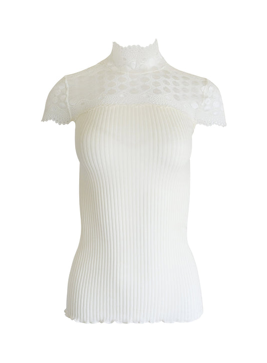 EGI Exclusive Merino Wool Blend Top Mock Neck Lace Trim Short Sleeves. Proudly Made in Italy.