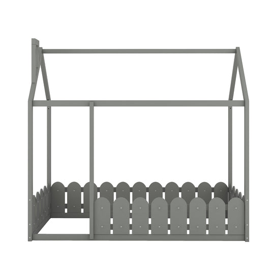 {Slats are not included}Twin Size Wood Bed House Bed Frame with Fence for Kids Teens Girls Boys {Gray}