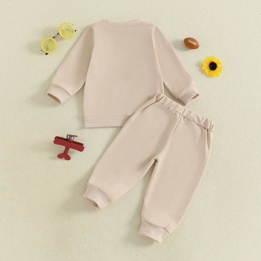 Baby Toddler Boys 2Pcs Go Team Fall Outfit Football Letter Embroidery Long Sleeve O-Neck Top and Solid Color Pants Set