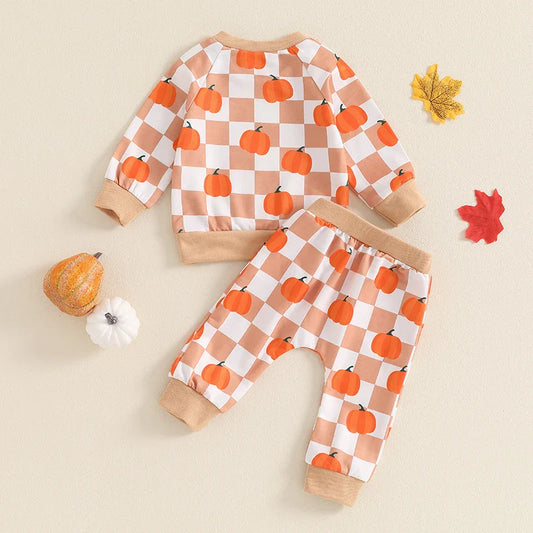 Baby Toddler Boys Girls 2Pcs Halloween Thanksgiving Outfit Checkered Pumpkin Print Long Sleeve Top and Long Pants Set
