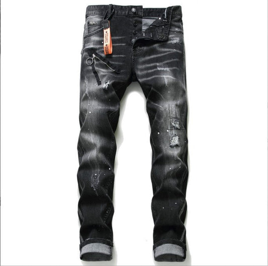 Black And Gray Paint Hole Zipper Decorations Personality Jeans Men