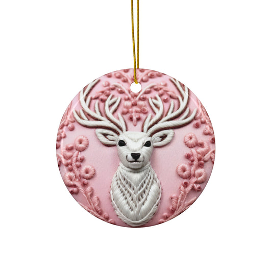 3D Embroidered Pink Christmas Deer #2 Ceramic Ornament