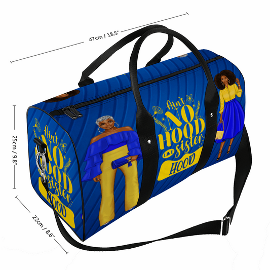Blue and Gold Aint No Hood Like Sisterhood Large Bag, Luggage, Travel, Gym, Travel Tote