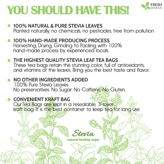 Stevia Leaf Tea Bags, 100% Natural & Pure Stevia leaves, Eco-Conscious Tea Bags, Stevia Herbal Tea. Stevia Leaf Tea. No Sugar, No Caffeine, No Gluten, Vegan
