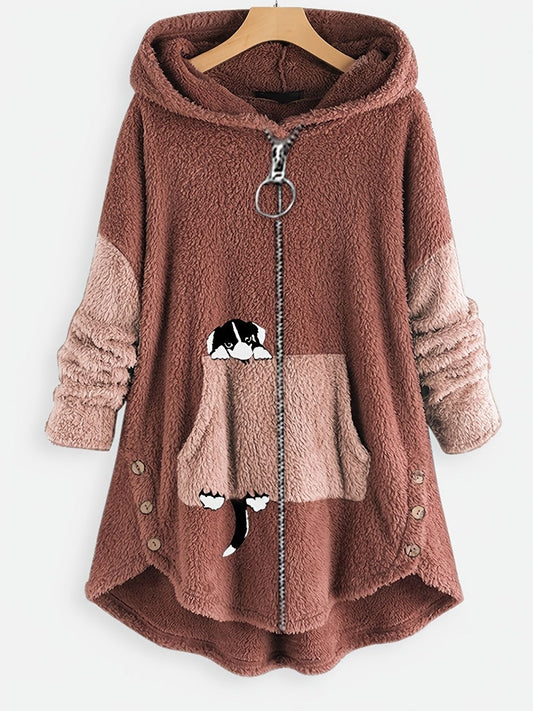 Plus Size Cartoon Puppy Print Colorblock Zip Up Hoodie Fuzzy Coat; Women's Plus Slight Stretch Casual Coat