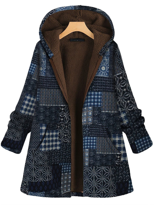 Plus Size Patchwork Print Hoodie Fleece Liner Thermal Coat; Women's Plus Long Sleeve Casual Coat
