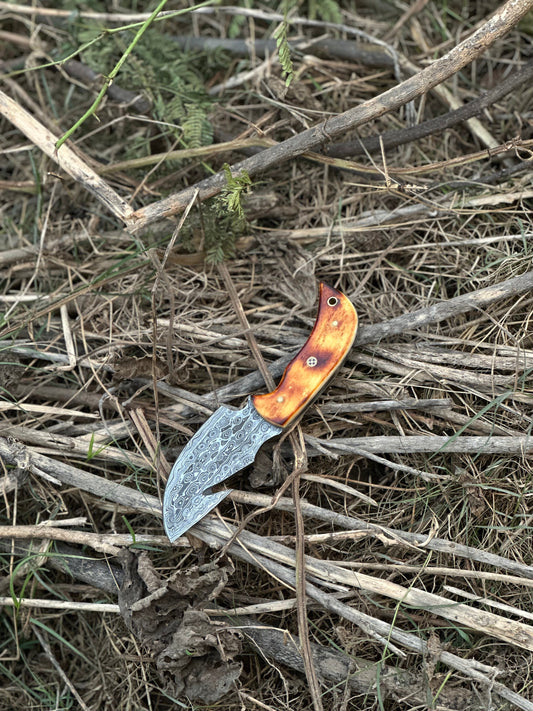 Custom Handmade Damascus Steel Guthook Skinning Knife with Rosewood & Resin Handle - 7.5” with Leather Sheath