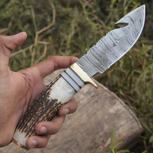 Custom Handmade Damascus Steel Guthook Skinning Knife – 9" Stag Horn Handle with Brass Guard & Leather Sheath
