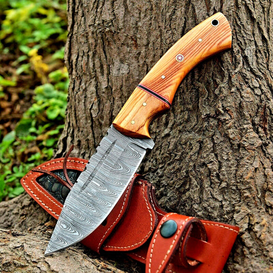 Custom Handmade 10" Damascus Steel Hunting Knife with Olive Wood Handle & Leather Sheath