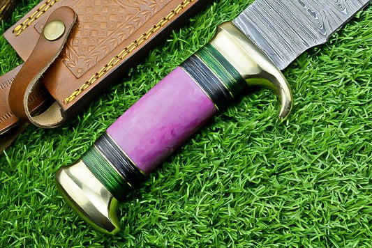 Damascus Steel "The Bowie Knife" - 16" Blade, Brass Guard, Resin Pakkawood Handle, with Leather Sheath