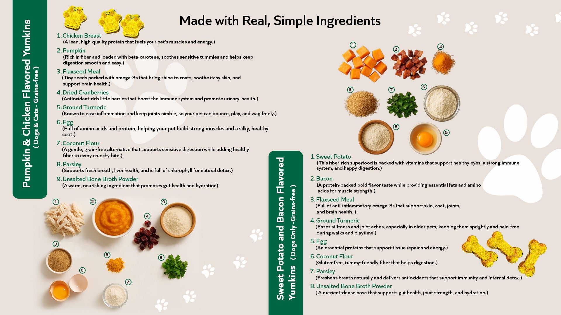 Small treats, big smiles! Our Pumpkin & Chicken Flavored Paws pack mighty nutrition into perfectly sized treats that cats and small dogs adore. Each paw shaped treat features real chicken as the star ingredient, creating a protein-rich snack that supports lean muscles and playful energy. The real pumpkin helps digestion for happy tummies, while cranberries boost urinary health. These crunchy little paws clean teeth while delivering pure joy to your pet! Perfect for training sessions when you need a small, high-value reward that won't fill pets up. Made with premium ingredients like coconut flour, flaxseed, and turmeric, they provide energy boosts when your pet needs it most. Our commitment means no artificial preservatives, no grains, and no fillers - just wholesome goodness in every bite. Watch your pet's excitement when these little paws appear!