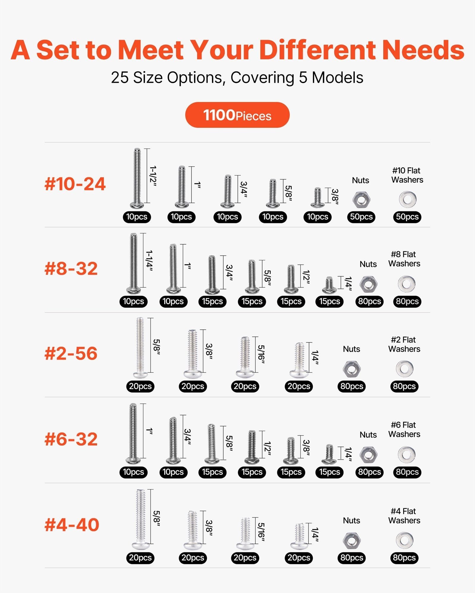 1110-Piece Multi-Specification Set: Includes imperial bolts, nuts, and washers in sizes #10-24, #8-32, #2-56, #6-32, #4-40 (with flat and spring washers in #10, #8, #2, #6, #4). Ideal for general repairs and replacements