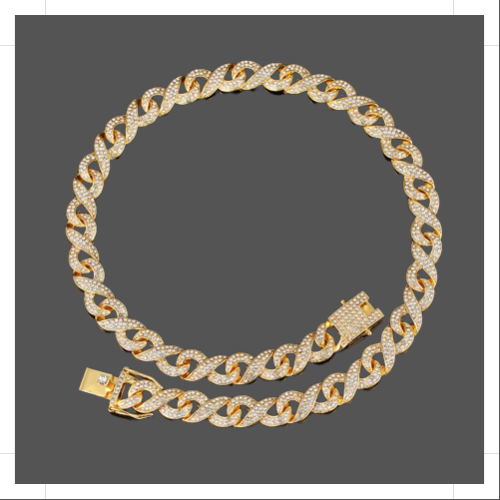 This 13mm Gold Infinity Link Chain provides a sleek, modern look. Its design features geometric shapes for a contemporary edge. Crafted from high quality copper, it is sure to last for years of wear. With its velvet bag included, this chain is perfect for any occasion.
