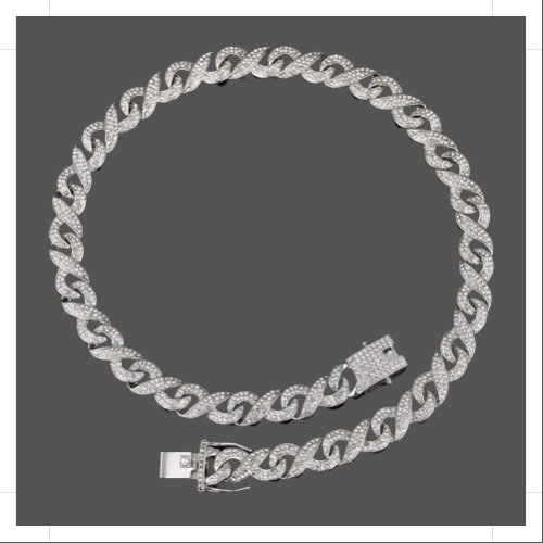 This 13mm Silver Infinity Link Chain provides a sleek, modern look. Its design features geometric shapes for a contemporary edge. Crafted from high quality copper, it is sure to last for years of wear. With its velvet bag included, this chain is perfect for any occasion.