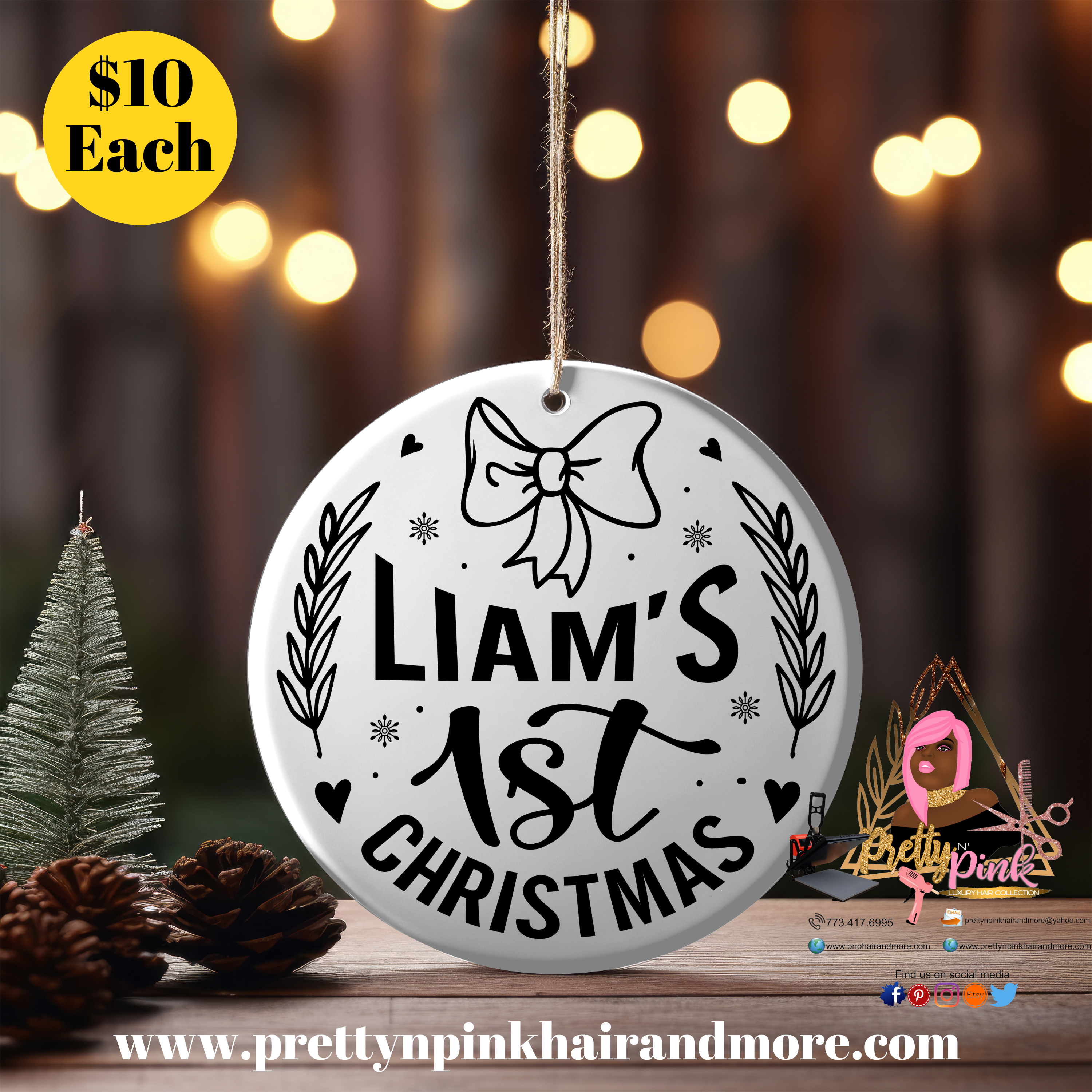 Christmas ornament. List the babies name and year of birth.Celebrate your baby's first Christmas with this adorable reindeer ornament! Customize it with their name and birth year for a special keepsake. Perfect as a gift or for your own holiday decor.