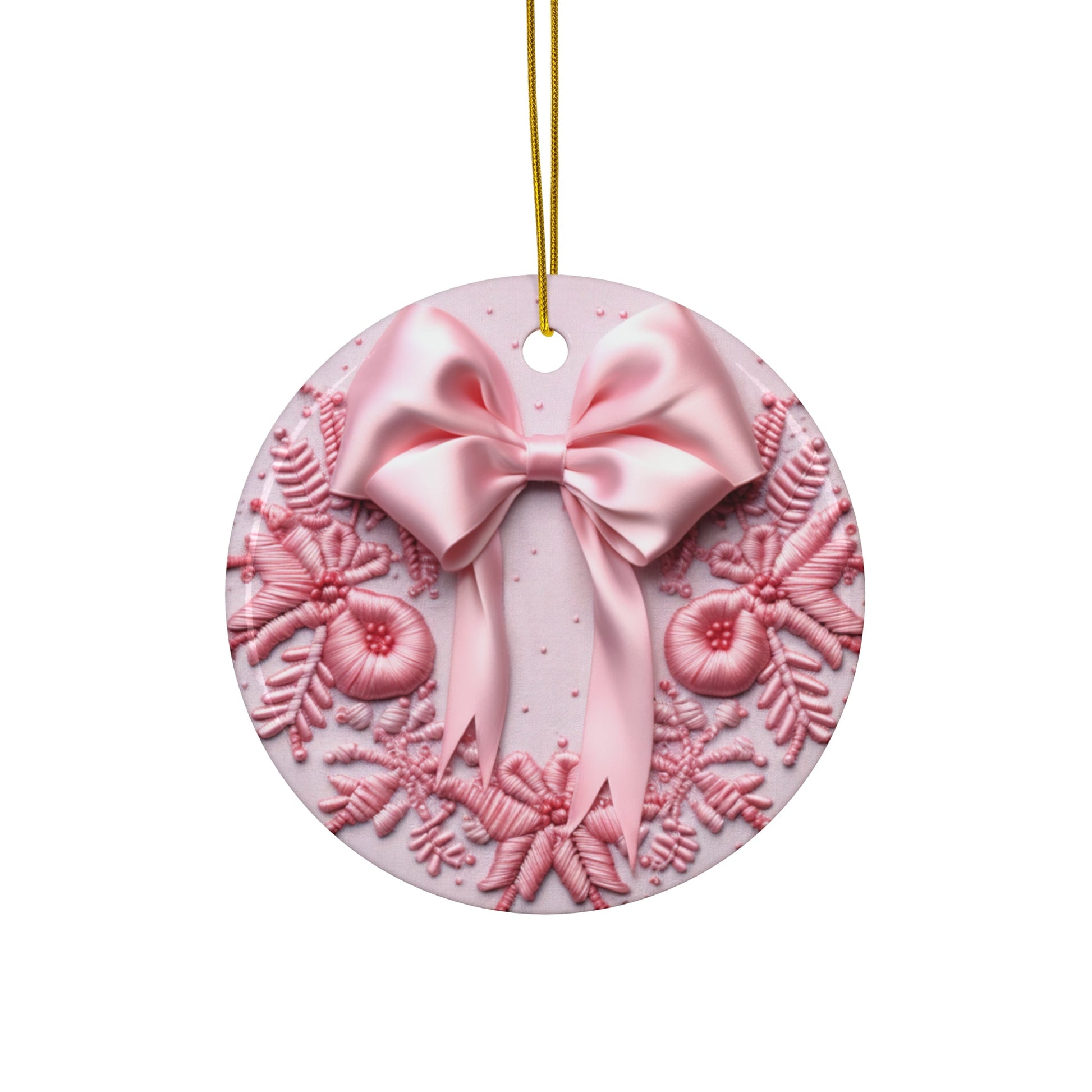 3D Embroidered Pink Christmas Bow Ceramic Ornament