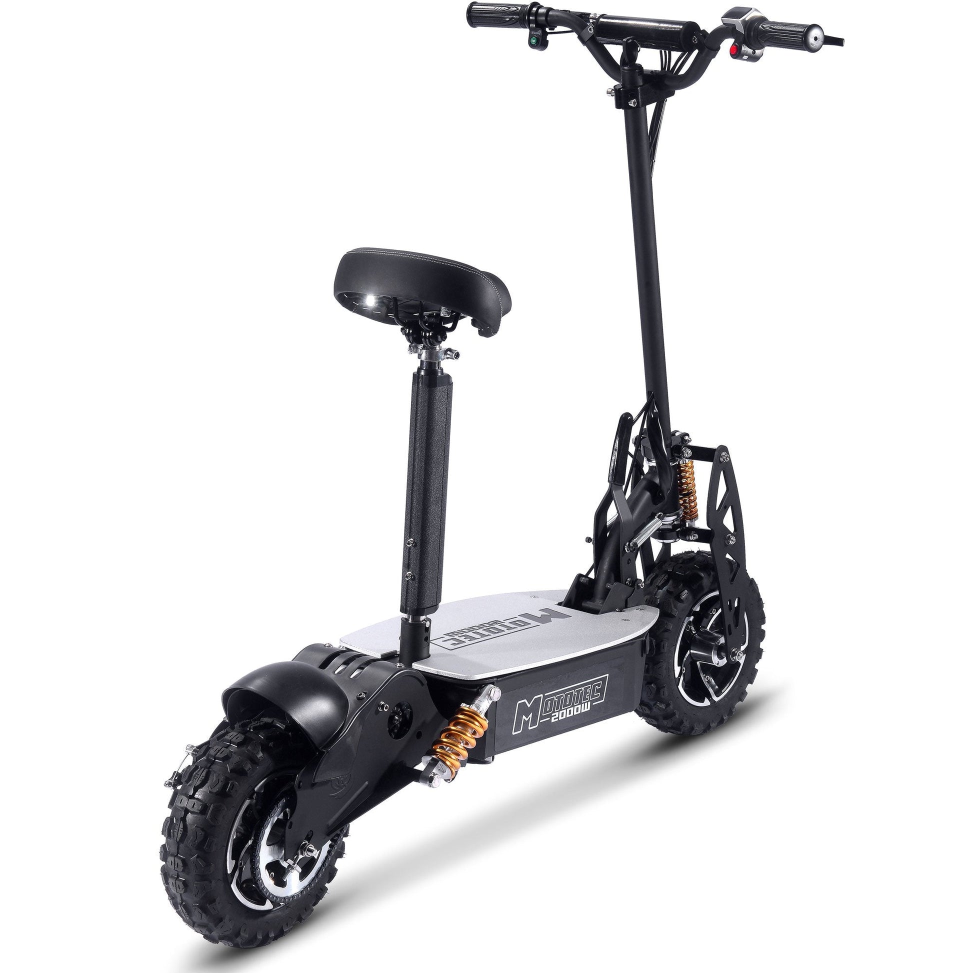 Drive System: Chain Motor: 2000 Watt 48 Volt (BRUSHLESS) Batteries: Four 12V/12AH (48 volt system) Sealed Lead Acid (SLA) Battery Life: 300 cycles Economy Mode: Yes (conserves battery power for longer rides) Charger Included: Yes Horn: Yes Foot Deck: Aluminum Shocks: Yes (single front, dual rear) Charging Time: 6-8 hours Brakes: Front & Rear Disc Tires/Front: 11 inch Pneumatic Knobby Tire Tires/Rear: 11 inch Pneumatic Knobby Tire Max load: 265 lbs Max Range: 10 to 20 miles per charge (weight dependant, terrain, economy mode selected etc.) Top Speed: 30mph Seat Included: Yes, Quick Release Foldable: Yes, Posi Lock Carton Size: 48x13x20 inches 110 lbs Product Size: Length 47 in, Height 42 in, Width 26 in Product Weight:105 lbs Folded Dimensions: 46x25x21 inches Warranty: 30 Days, Parts Replacement