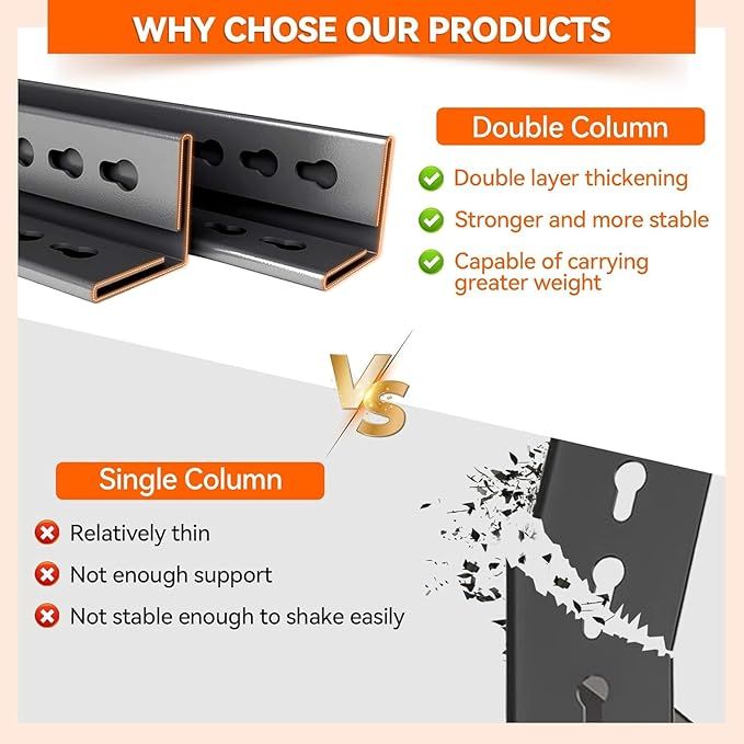 Upgraded Dual-Layer Columns for Enhanced Stability Unlike standard single-layer columns, our shelves feature upgraded dual-layer columns, significantly boosting stability and load capacity. The reinforced structure distributes weight evenly, reducing warping or sagging risk over time. This ensures stability under heavy loads. In contrast, single-layer columns can wobble or bend with heavier items, making them less reliable for bulkier tools/materials.