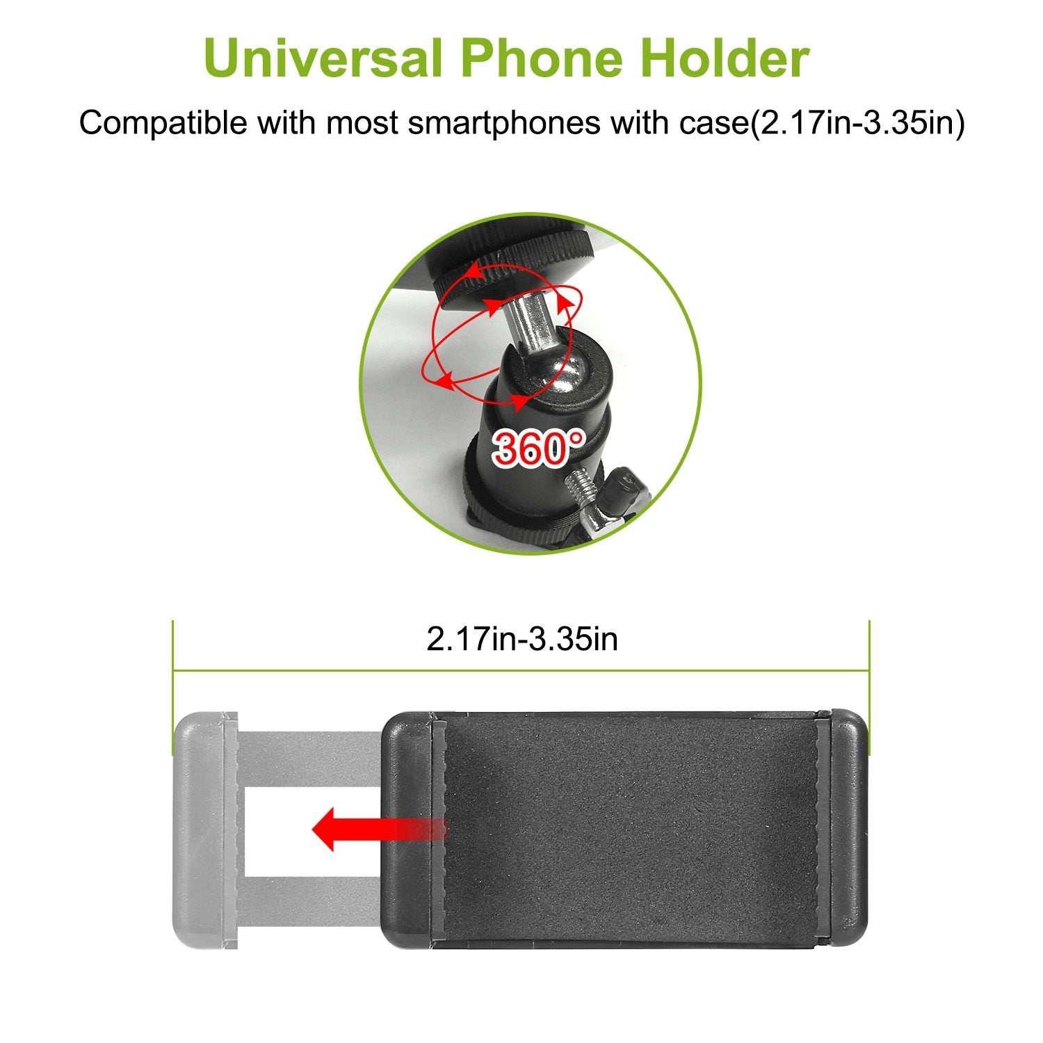 ** ROTATABLE PHONE HOLDER*:Our 9 inch LED ring light comes with a metal tripod stand and cell phone holder,the 360 degree rotatable circular cloud platform can be free to adjust to any angle and clamping range from 2.17inches to 3.35inches,that is,it can hold the most sized smartphones in the market,including for iPhone X/iPhone 8/8 Plus /iPhone 7/7 Plus.