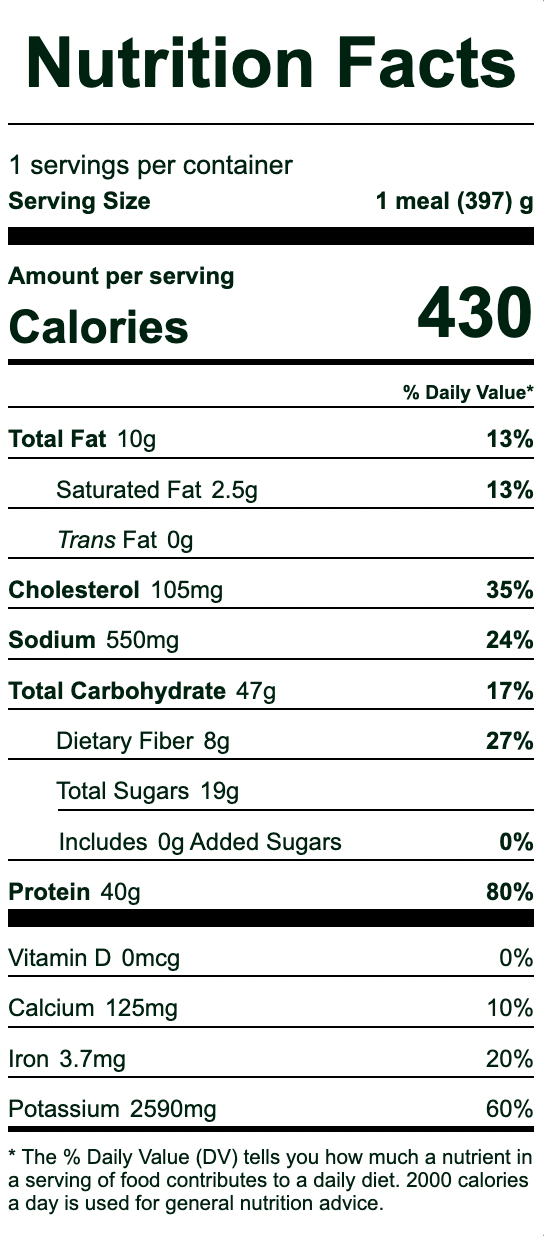 Nutrition Facts: Serving Size 14 oz | Cal: 430 | Fat (g): 10 | Sodium (mg): 550 | Carbs (g): 47 | Fiber (g): 8 | Sugar (g): 19 Protein (g): 40