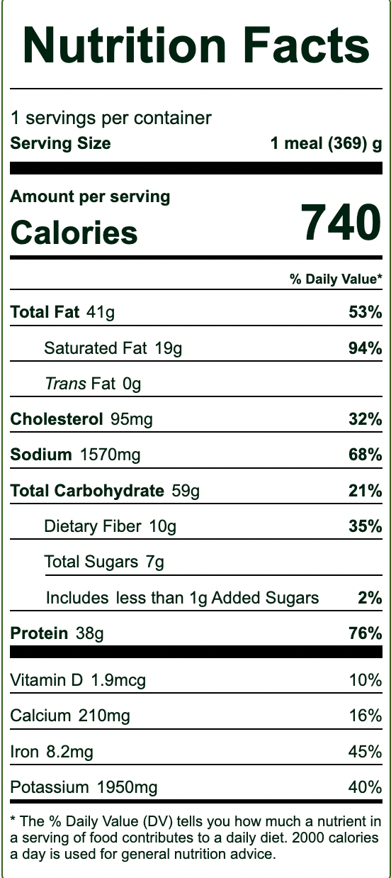 Nutrition Facts: Serving Size 13 oz | Cal: 740 | Fat (g): 41 | Sodium (mg): 1570 | Carbs (g): 59 | Fiber (g): 10 | Sugar (g): 7 Protein (g): 38