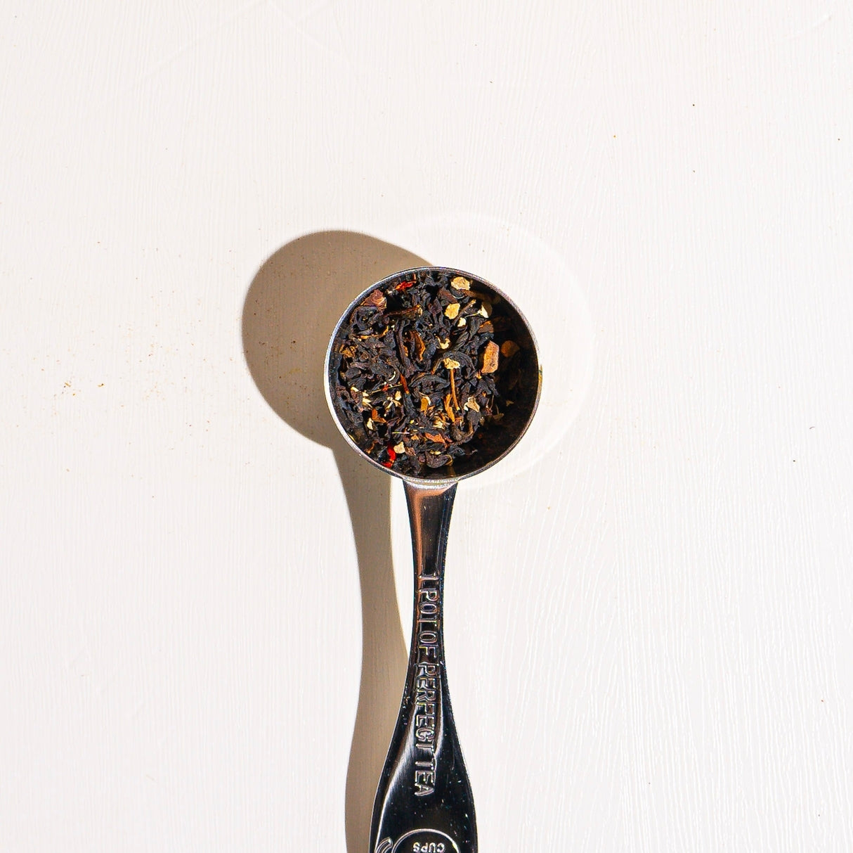 Luxury Ingredients: Black tea, Apple pieces, Blackberry + Lime leaves, hibiscus, Rosehip, Safflower petals, Cardamom, Ginger, Black + White pepper, Cinnamon, Clove, Nutmeg., and Natural flavors (organic compliant).