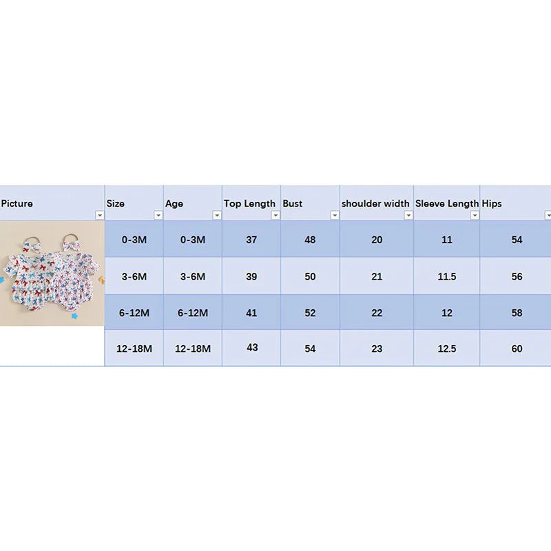 0-3M Length: 14.57 Bust: 18.9 Sleeve: 4.33 Shoulder: 7.87 Hip: 21.26 Advised Age: 0-3 Months