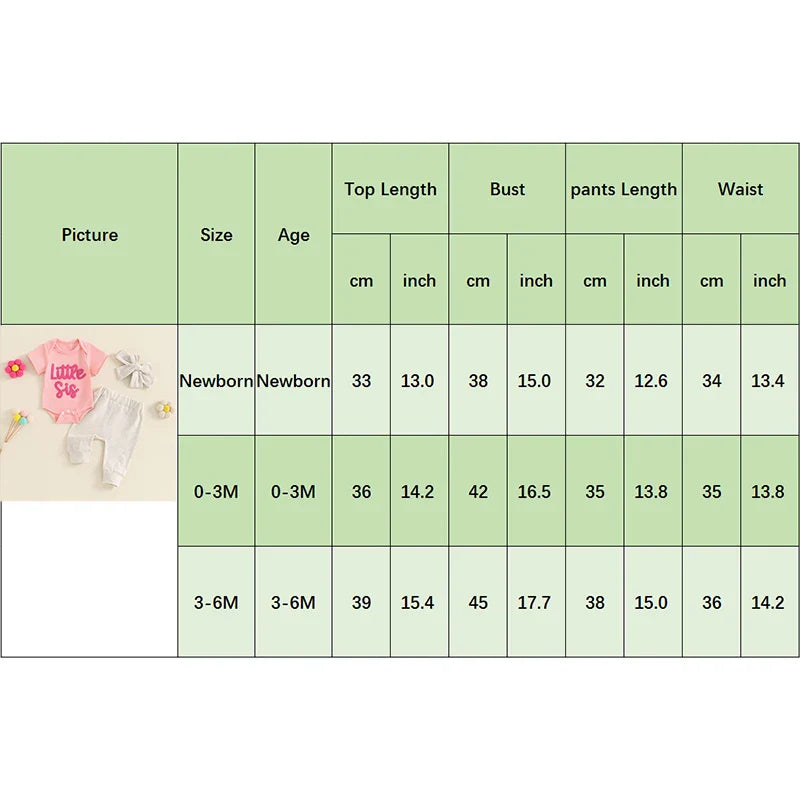 3-6M Length: 15.35 Bust: 17.72 Waist: 14.17 Pants Length: 14.96 Advised Age: 3-6 Months