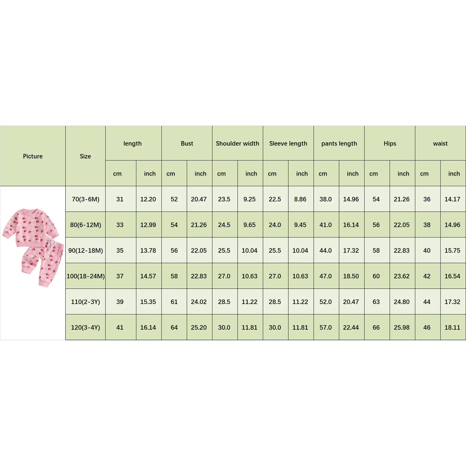 18-24Y Tops Length: 14.57 Bust: 22.83 Shoulder: 10.63 Sleeve: 10.63 Pants Length: 18.50 Waist: 16.54 Hip: 23.62 Advised Age: 18-24 Months