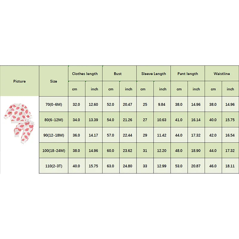 80 Tops Length: 13.39 Bust: 21.26 Sleeve: 10.63 Shoulder: 8.66 Pants Length: 16.14 Waist: 15.75 Hip: 22.05 Advised Age: 6-12 Months