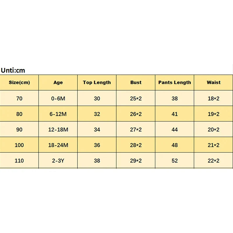 2-3Y Tops Length: 14.96 Bust: 22.83 Pants Length: 20.47 Waist: 17.32 Advised Age: 2-3 Years