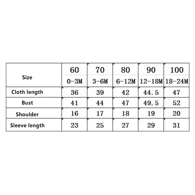 60 Length: 14.17 Bust: 16.14 Sleeve: 9.06 Shoulder: 6.3 Advised Age: 0-3 Months