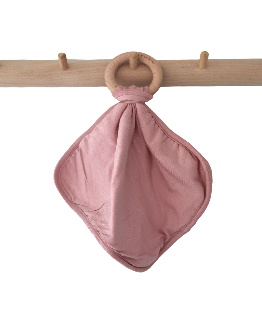 Our snug as a bug Bamboo Loveys are made from super soft bamboo fabric with detachable, all-natural beech wooded ring to relieve teething symptoms. You can easily detach the wooden ring and attach the lovey to baby’s pacifier, teether or toy