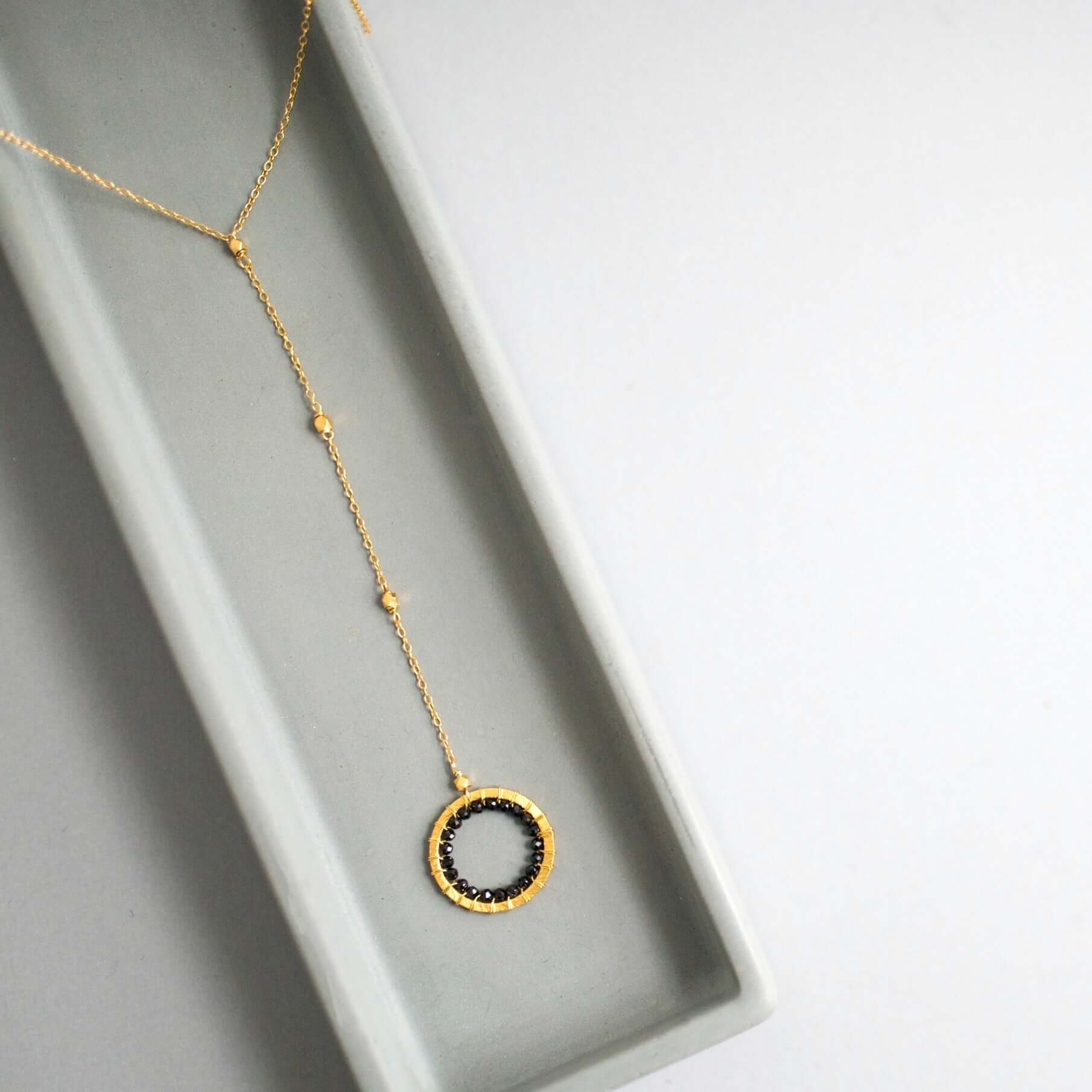 The Halo collection was our very first one. Intended to symbolize the intricate, universal energy woven within us all. This beautiful necklaces is ultra lightweight and perfectly handmade featuring sparkling black spinel gems woven into our unique, mini floating Y pendant design.