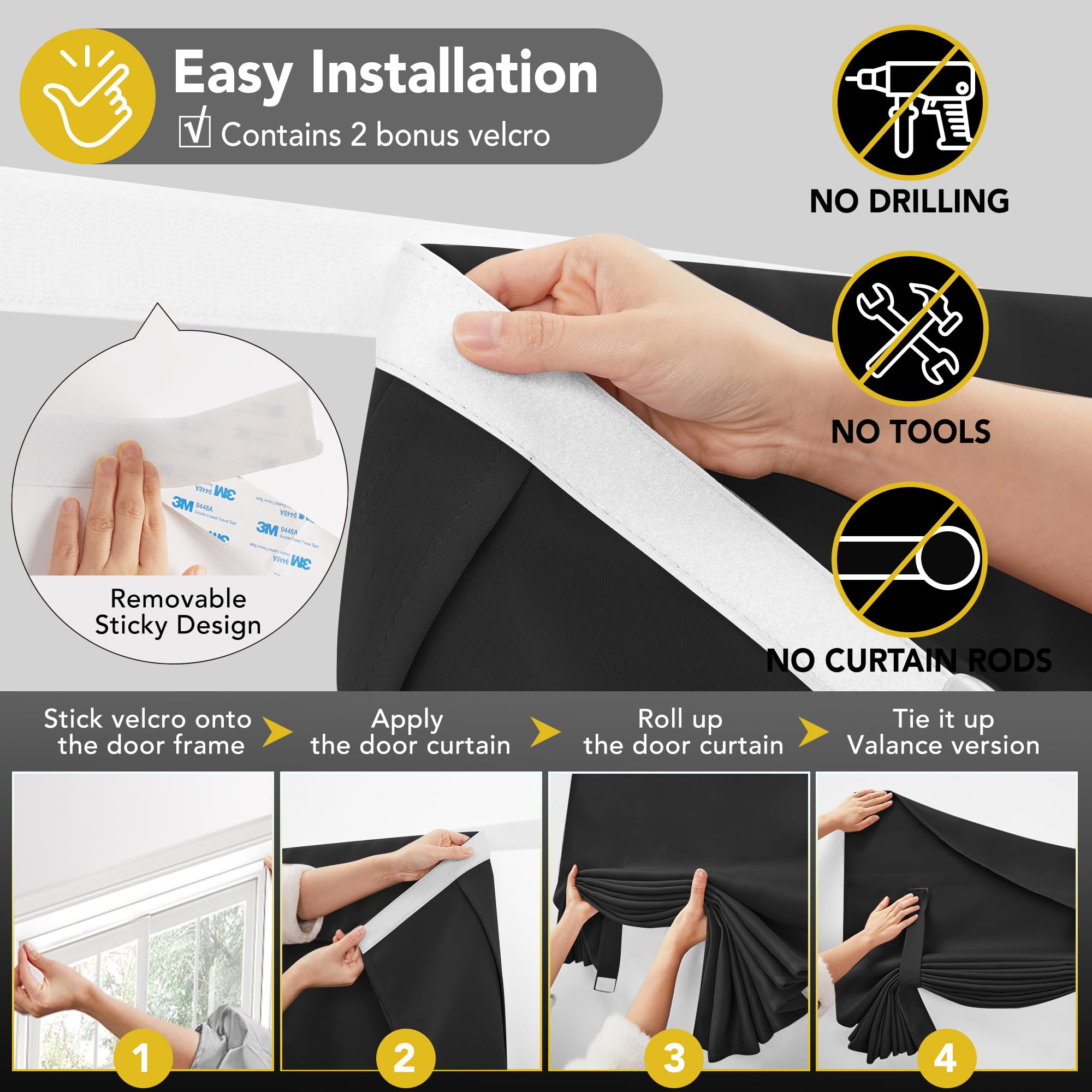 • No Rod? No Problem: Hook-and-loop adhesive system enables easy, drill-free installation¡ªperfect for renters, classrooms, or RVs.