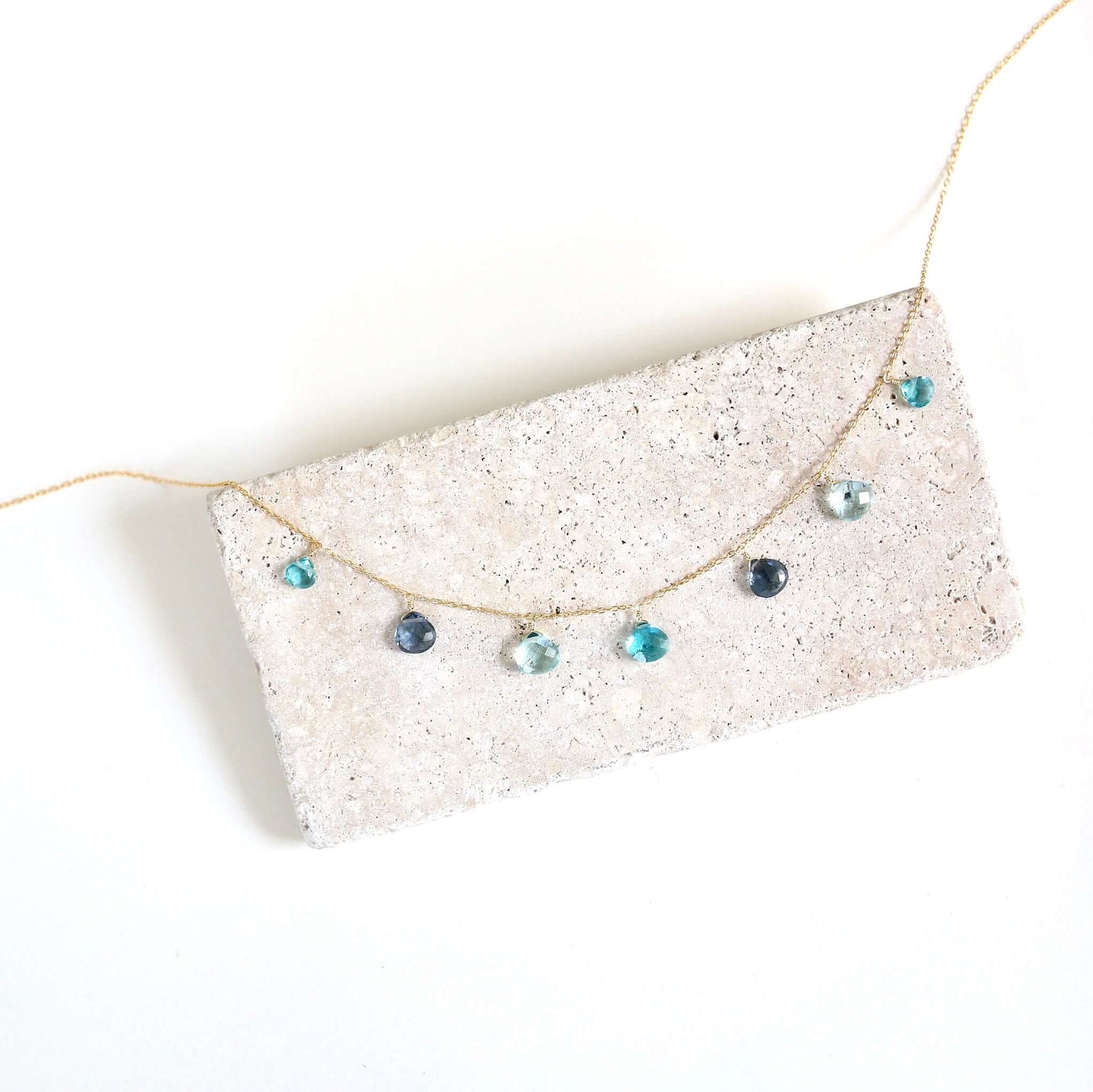 A lovely string of sparkling gems. Featuring Aquamarine, Iolite, and Aquamarine Blue Quartz gemstones, this 16-18" necklace comes with a 2" extender and a spring ring clasp. Made in our NYC studio with fine Italian sterling silver plated in rhodium, this gorgeous strand of gems shines like white gold and stays tarnish-free. Plus, each gemstone's unique nature makes this necklace truly one-of-a-kind. Packaged in a gift box and handmade to last.