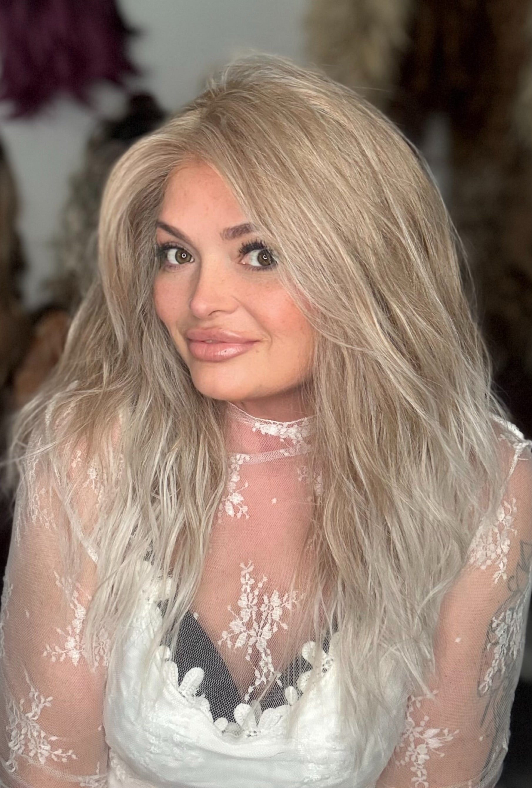 Experience the ultimate versatility with BREANNE,. Our 13 x 4 lace front and free part allow for effortless styling while our soft kinky texture and curtain bangs add a touch of natural elegance. Made with premium heat resistant synthetic fiber, its stunning blonde balayage will last without rooting. Adjustable straps and a standard cap size ensure a comfortable fit.