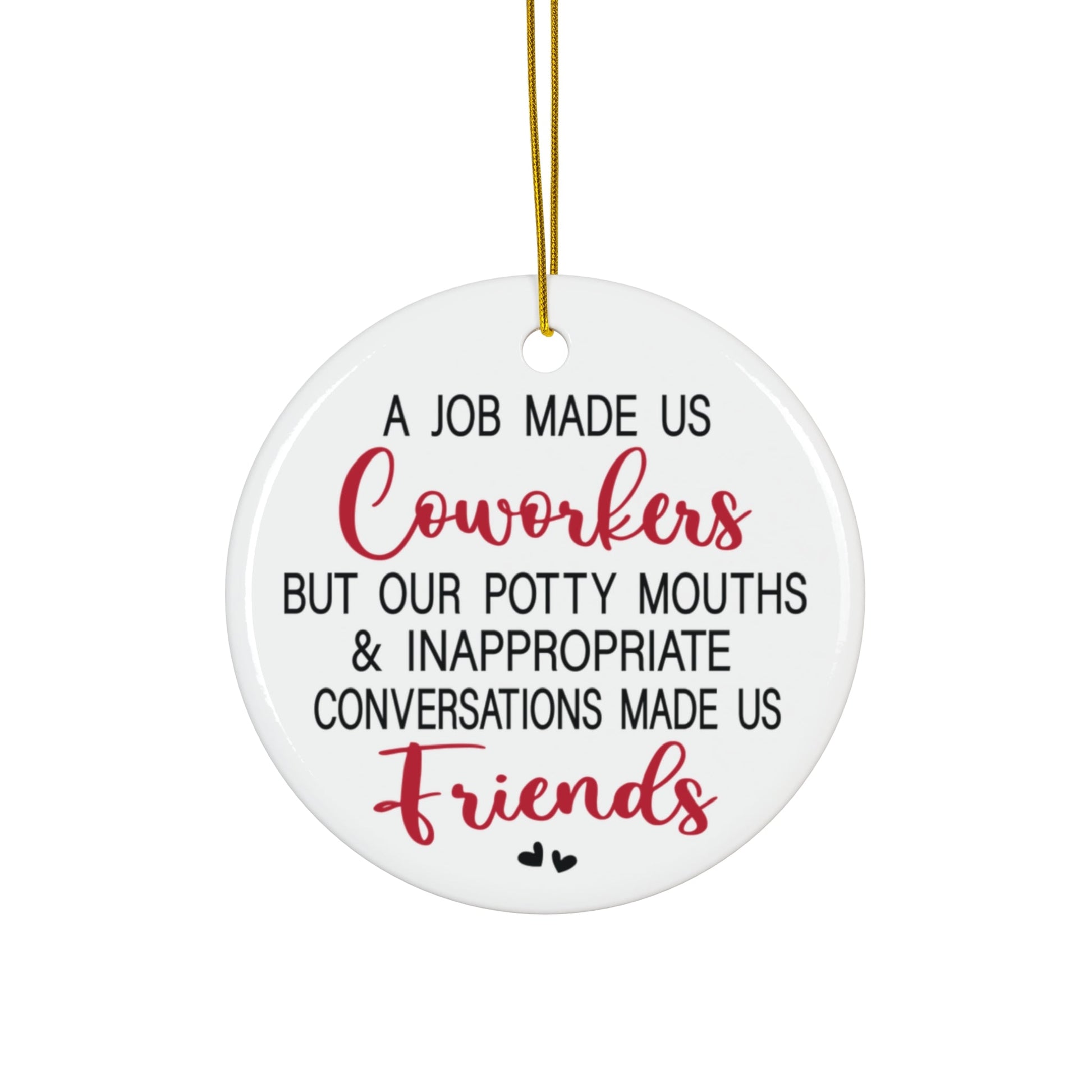 Celebrate the festive season with a sprinkle of laughter and a touch of personalization! Our Co-Worker Funny Christmas Holiday Ceramic Ornament is the perfect gift for your office buddies, friends, or anyone who appreciates a good laugh during the holidays. Available in four unique shapes, this ornament is designed to bring joy and a sense of camaraderie to any Christmas tree or holiday display.