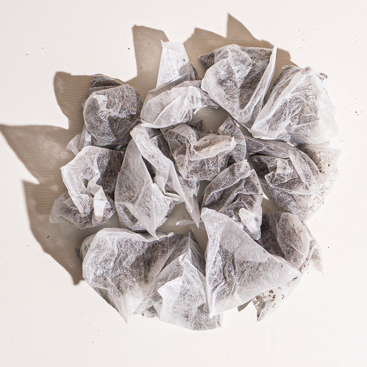 The tea bags are unbleached, free of wasteful envelopes, staples, strings or tags of any kind.