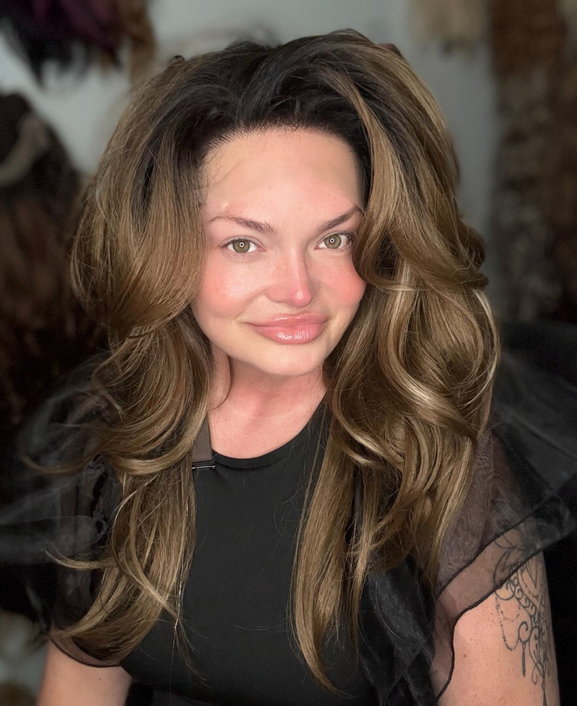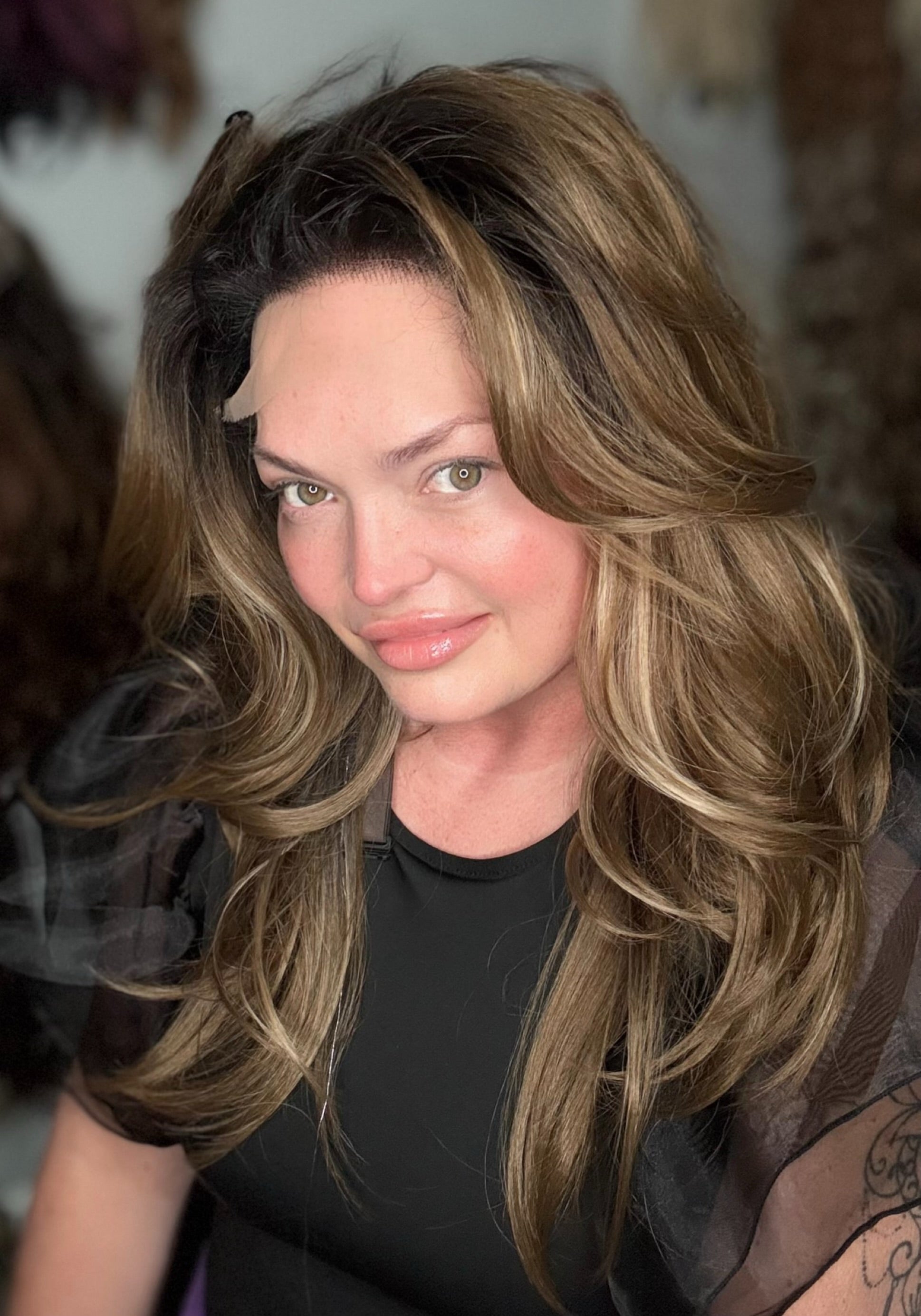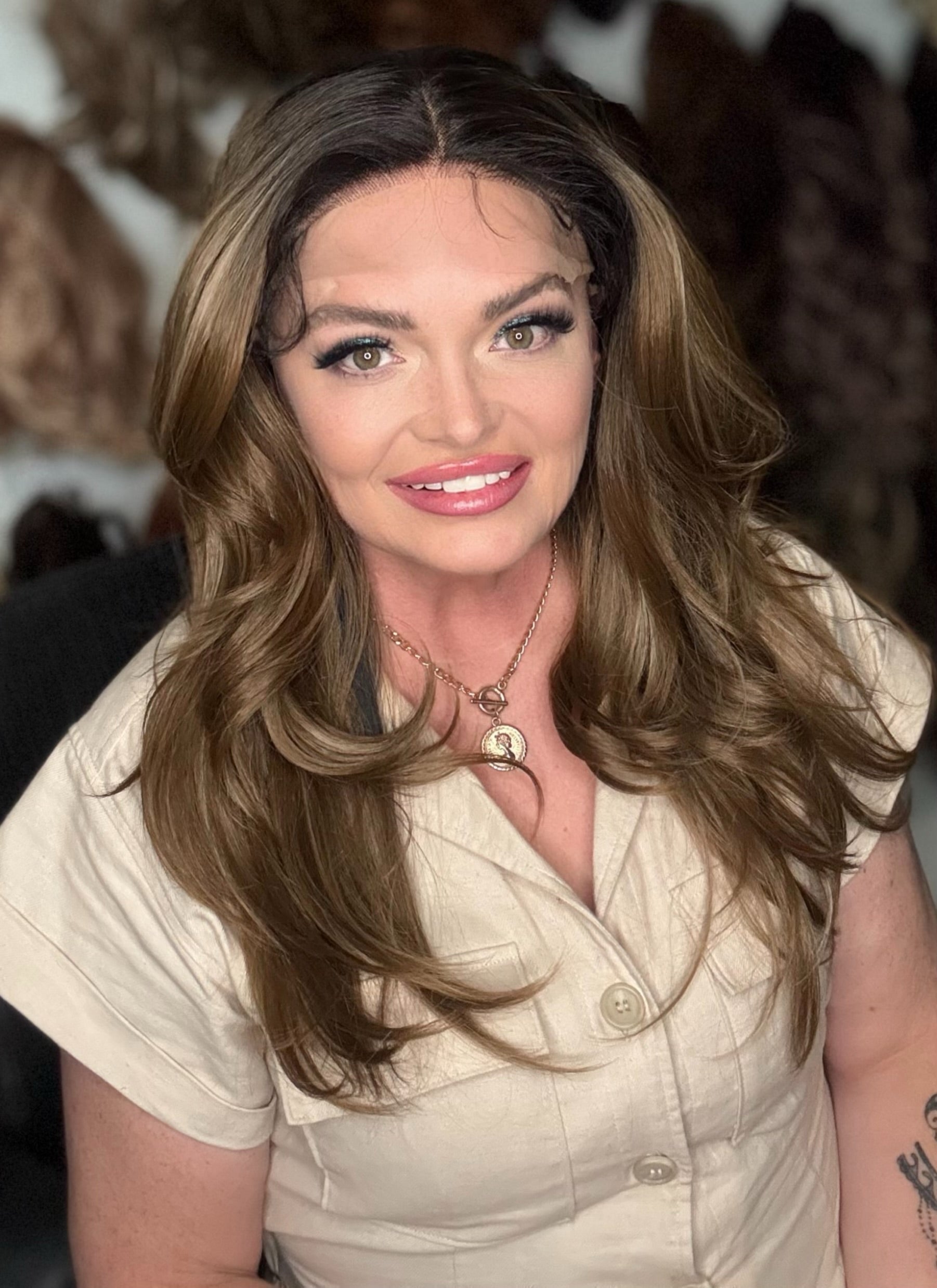 As a premium heat resistant, synthetic fiber, CRASHELLE's 13 x 6 lace front provides adjustable comfort with stunning brown balayage and long curtain bangs. This 22 inch wig comes in standard cap size, includes a free part, and is in stock and ready to ship within 10 to 14 days.
