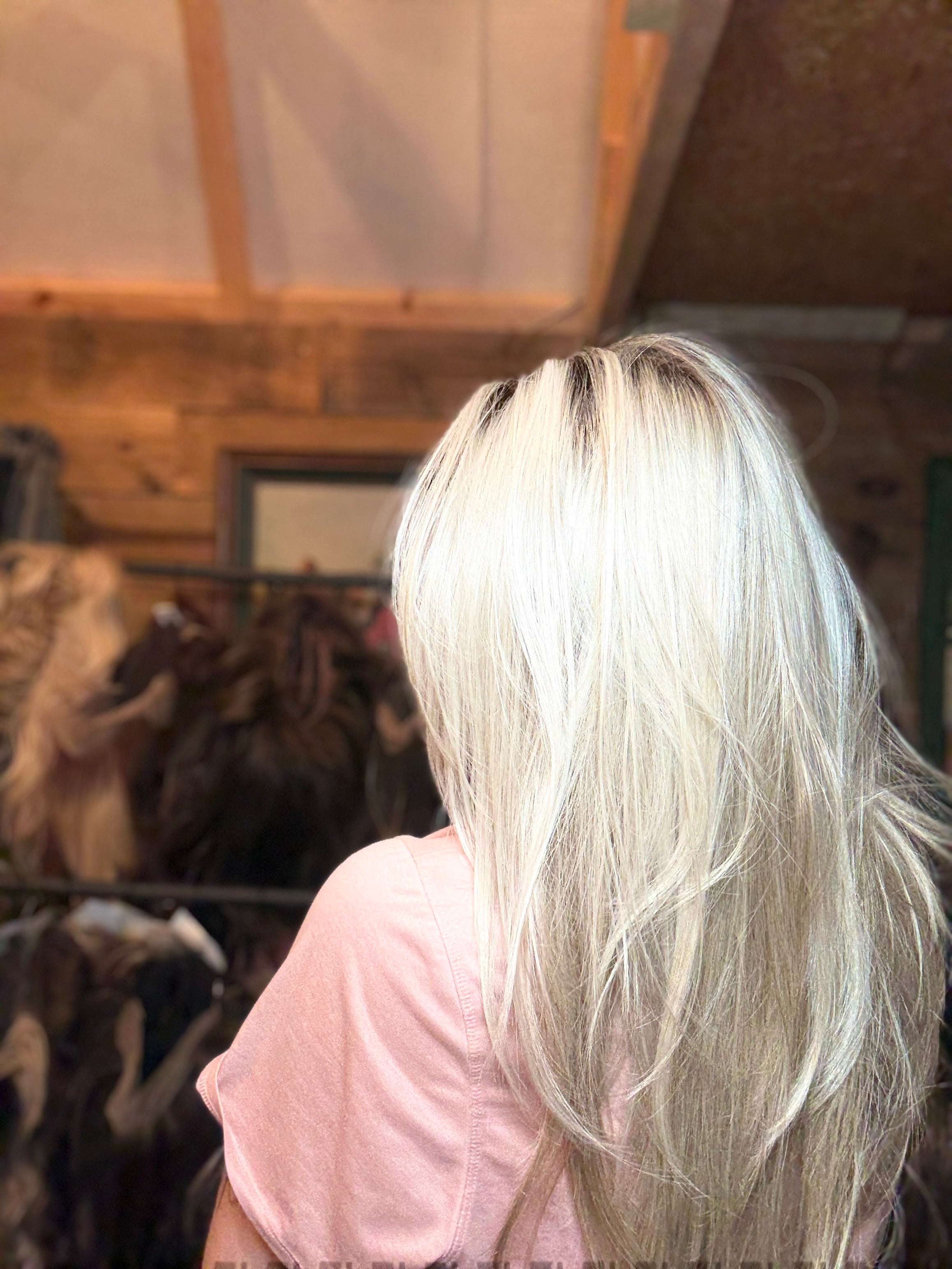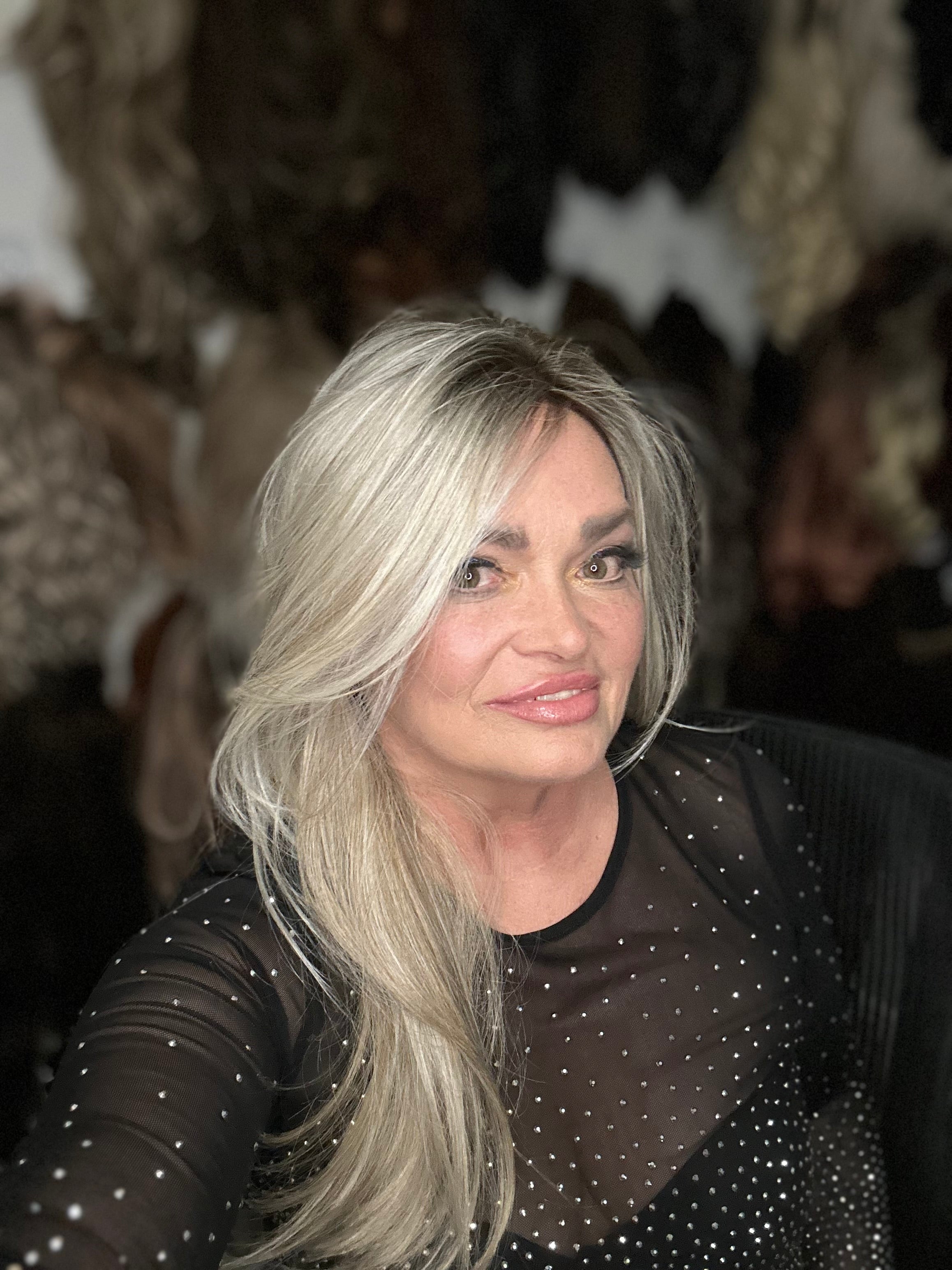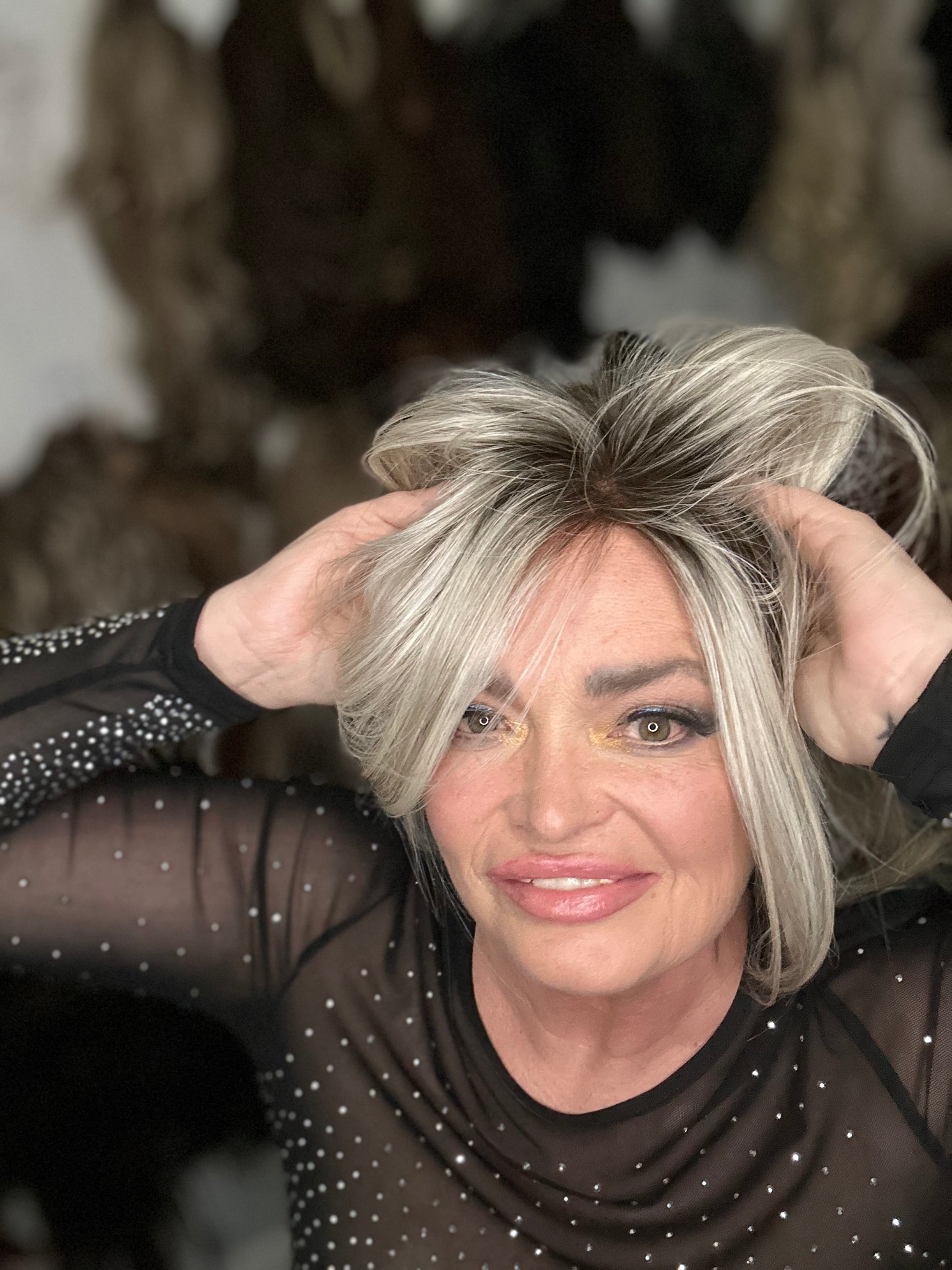 DESIREE Mono: Luxury meets versatility with our full monofilament lace front wig. The high-quality, heat resistant Futura synthetic fiber blend allows for styling options, while the adjustable Velcro straps ensure a perfect fit. The stunning platinum color with warm blonde undertones and dark rooting adds a touch of sophistication to any look. Available in petite to standard cap sizes. In stock and ready to ship within 14 days.