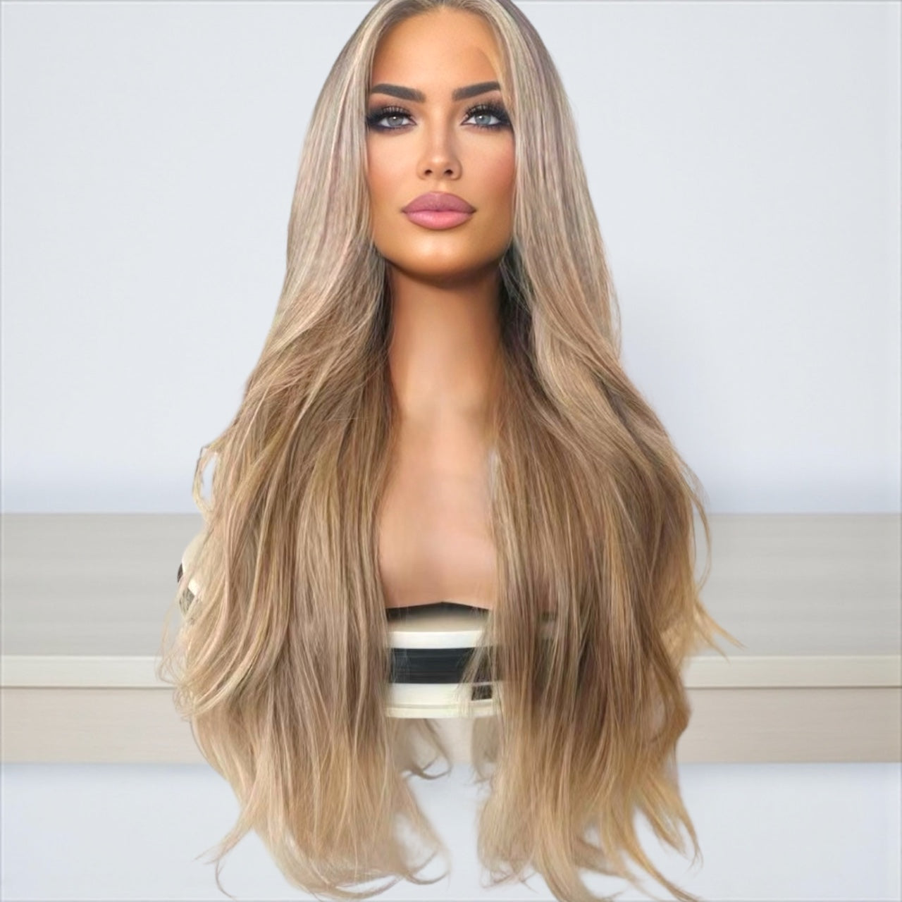 The DYLAN wig features a 13x4 lace front with a free part, allowing versatile styling options. Crafted from premium heat-resistant synthetic fiber, it offers durability and the ability to style with heat tools. Measuring 26 inches, its loose curls cascade in long layers, enhanced by a stunning dark blonde blend complemented by a Scandinavian hairline for a natural appearance. Adjustable straps and a standard cap size ensure a comfortable, secure fit. Custom Aqualocks technology adds moisture retention and shine, making DYLAN a sophisticated choice for an expert look.