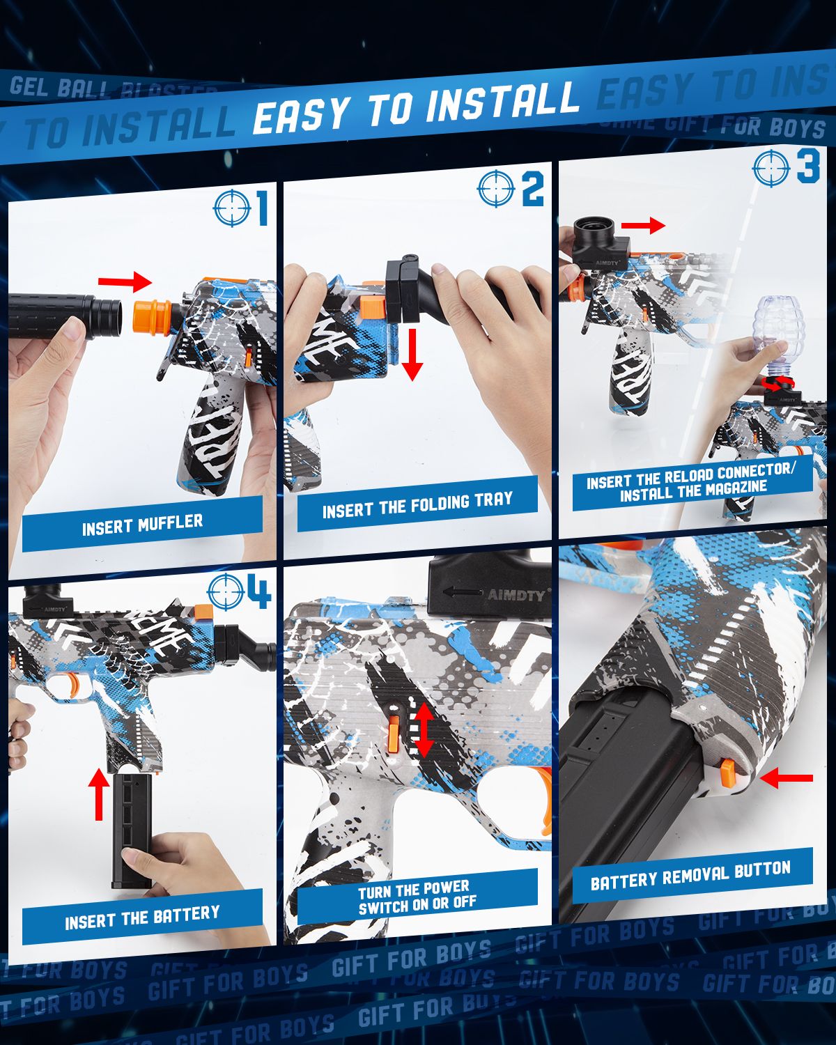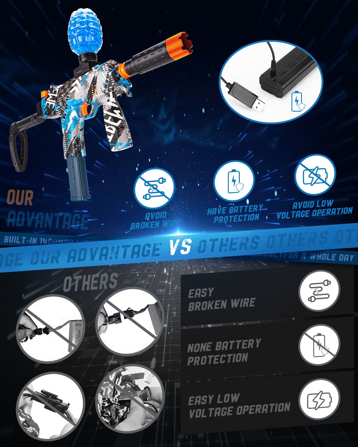 [Cool AKM Orbi Gun]: This gel ball blaster gun is a new style designed. The motor has been upgraded and improved for better stability. With hard gears, the gel ball injector lasts longer. ABS makes the splash ball jet more durable, drop-resistant, and more heat-resistant. This splat gun charges very fast and lasts longer.