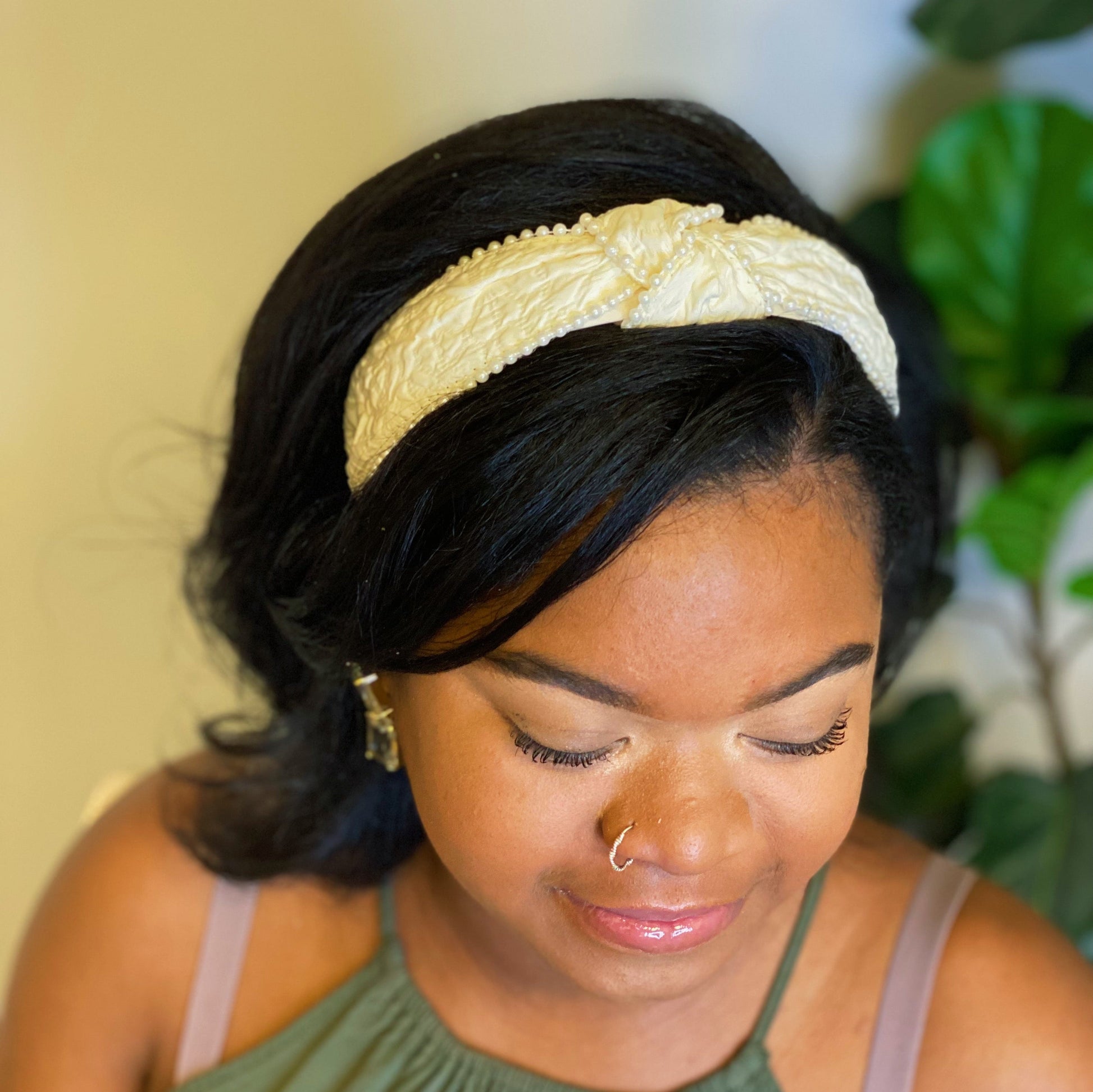 This Elegant Knot Pearl Embellished Headband adds a classic and stylish touch to any look. Crafted from an embossed fabric, it features a full complement of pearl embellishments. Perfect for special occasions like weddings or everyday wear.