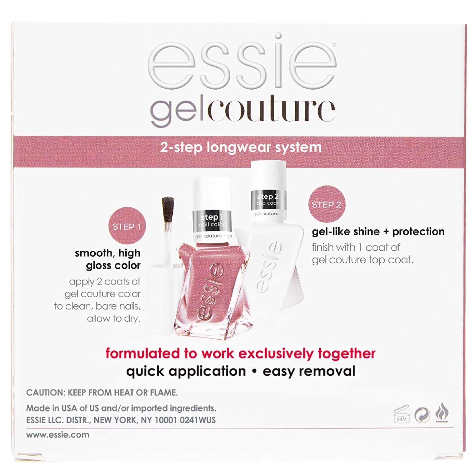 Essie's Gel Couture Nail Polish + Top Coat Kit is a luxurious longwear with gel-like color and shine in an easy 2-step system. No lamp needed, easy removal. Patent-pending curve hugging brush for perfect essie color coverage. Use with gel couture top coat for optimal results. An extravagantly sophisticated collection, crafted to perfection and fashioned to last.