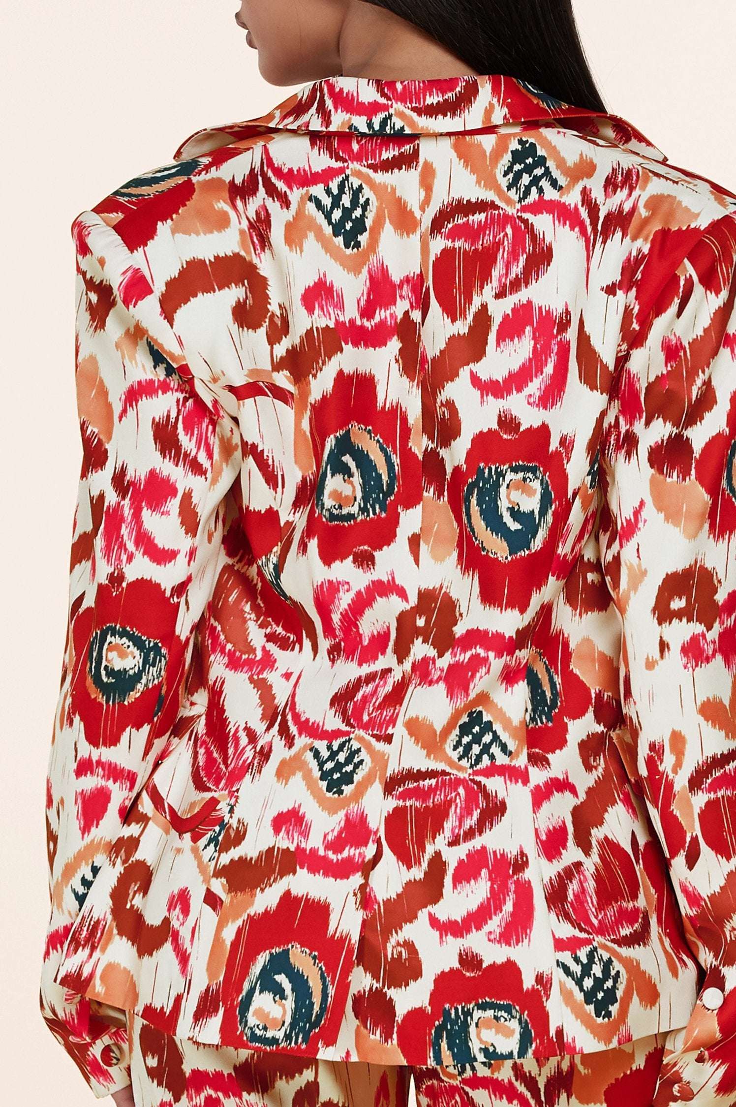 White Red Flower print 3pc Blazer set features a Blazer that has a collared neckline with lapels. A relaxed, wide-cut bodice. Followed by High-Waisted Trouser Pants shapes a pleated high-rise fit . A relaxed silhouette with straight pant legs. Ending with a Bandeau Top that shapes a bandeau-style silhouette.