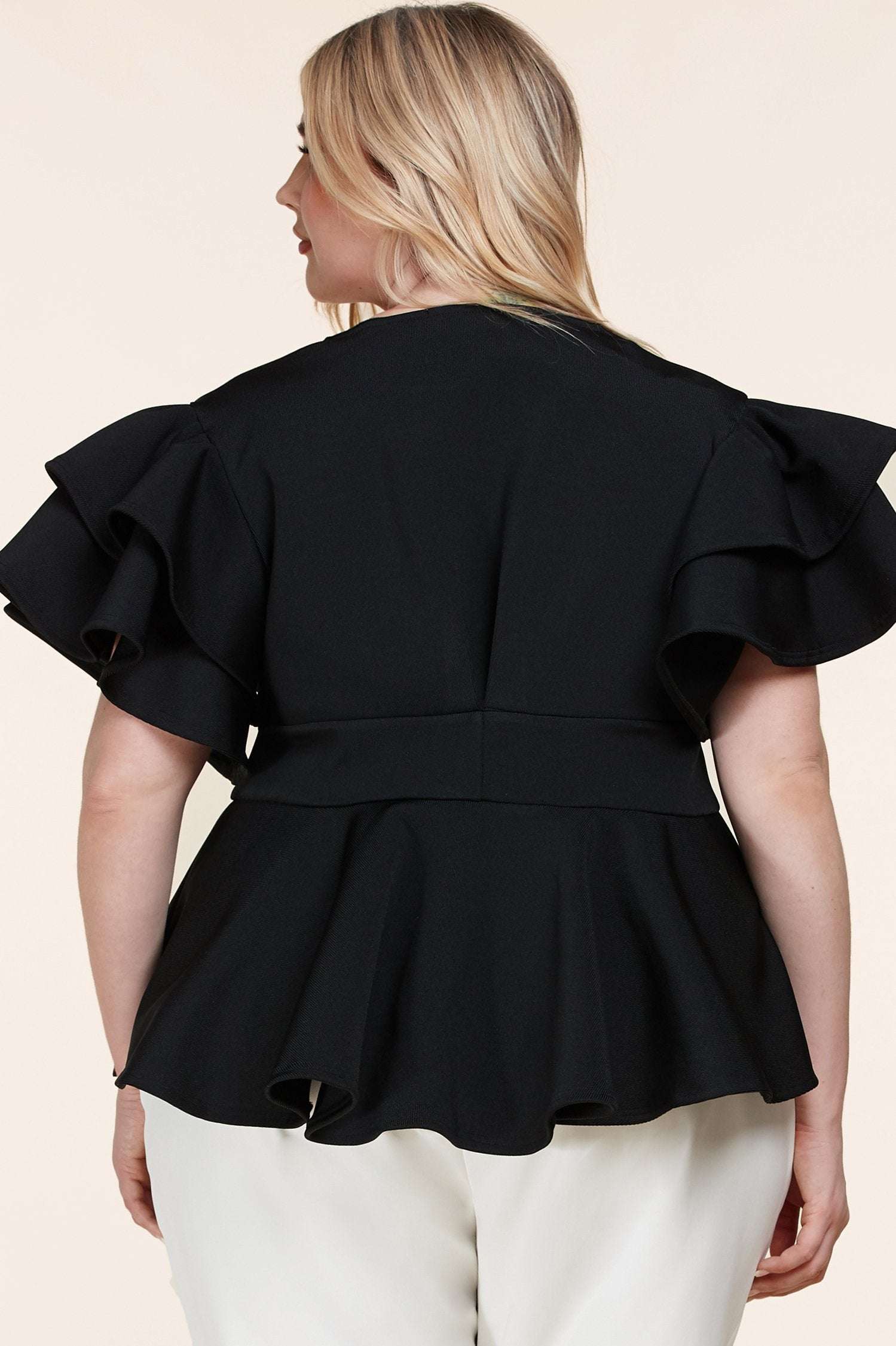 Fasheabe Plus Size Black Ruffle Plunging V-Neck Fit and Flare Top