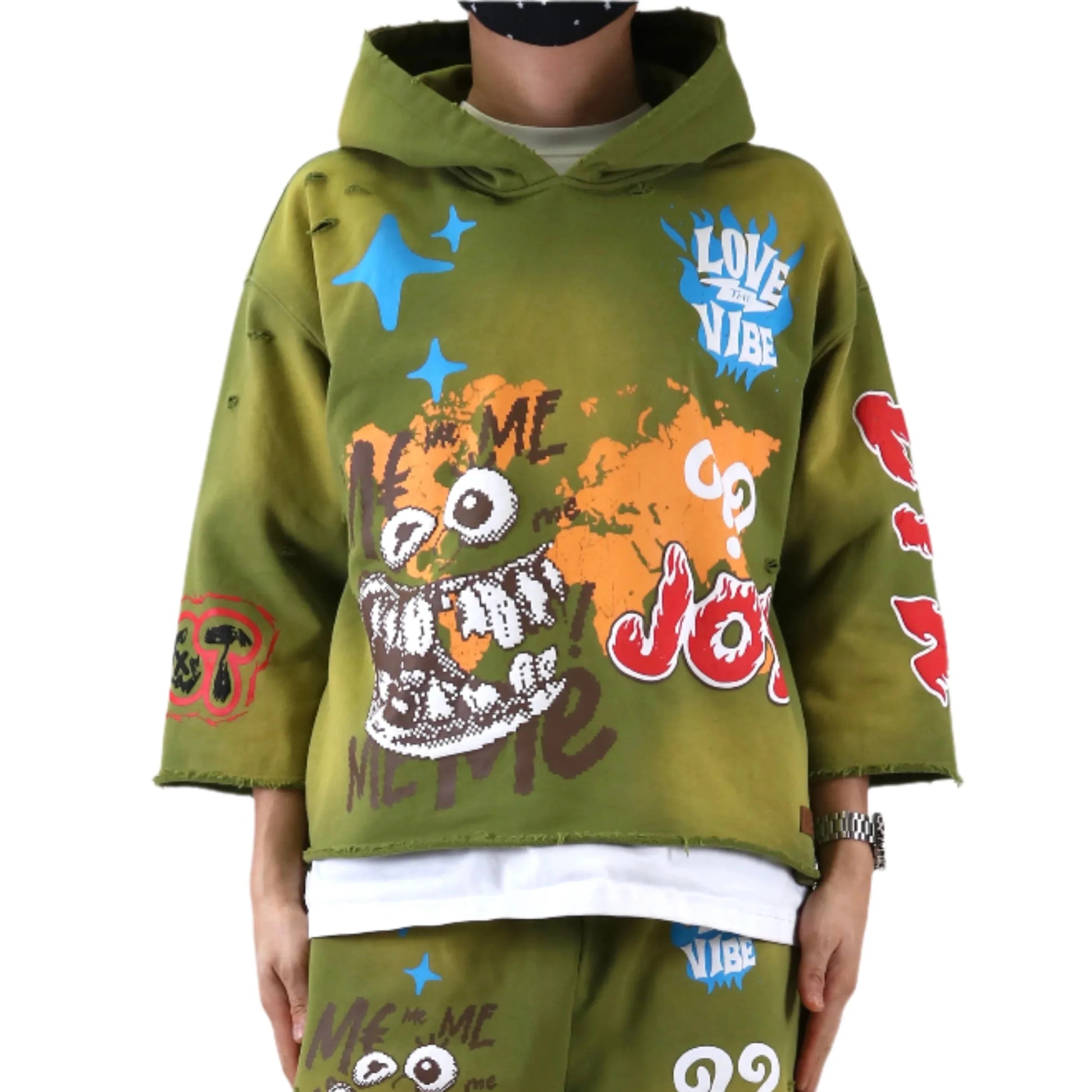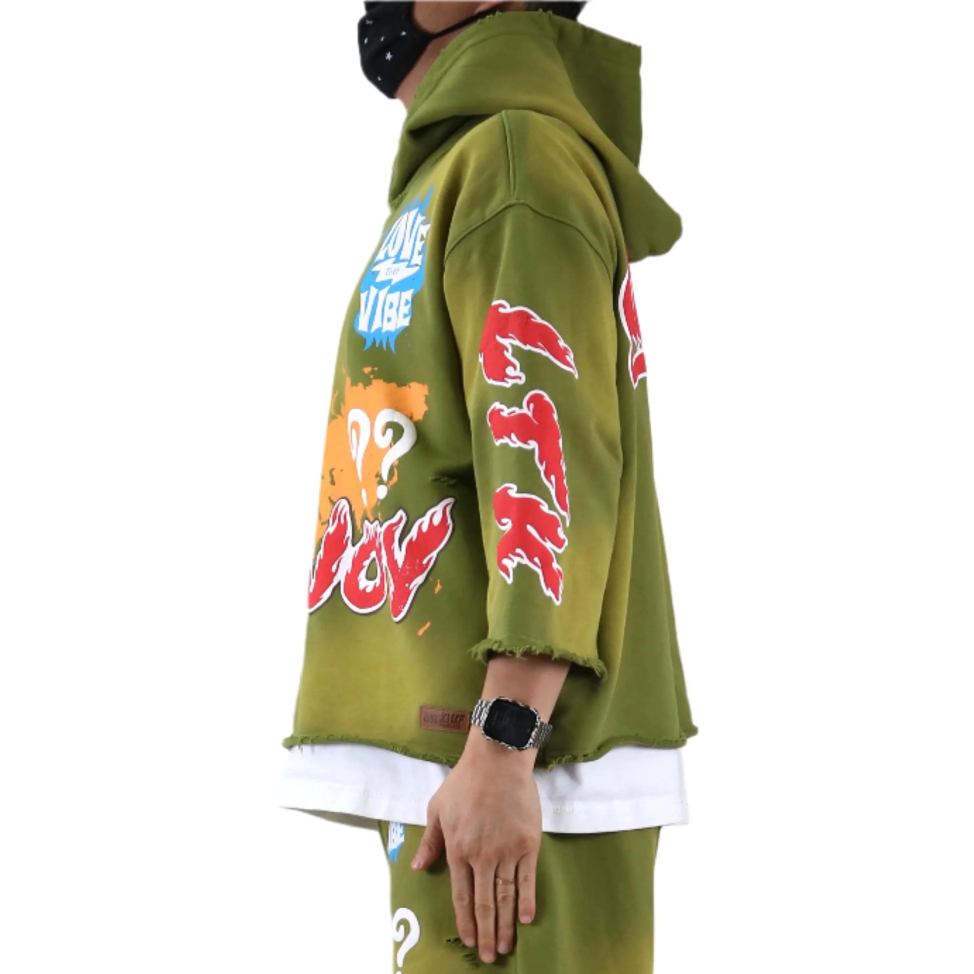 • Solid French Terry 3/4 sleeve Crop Top Pullover Hoodie