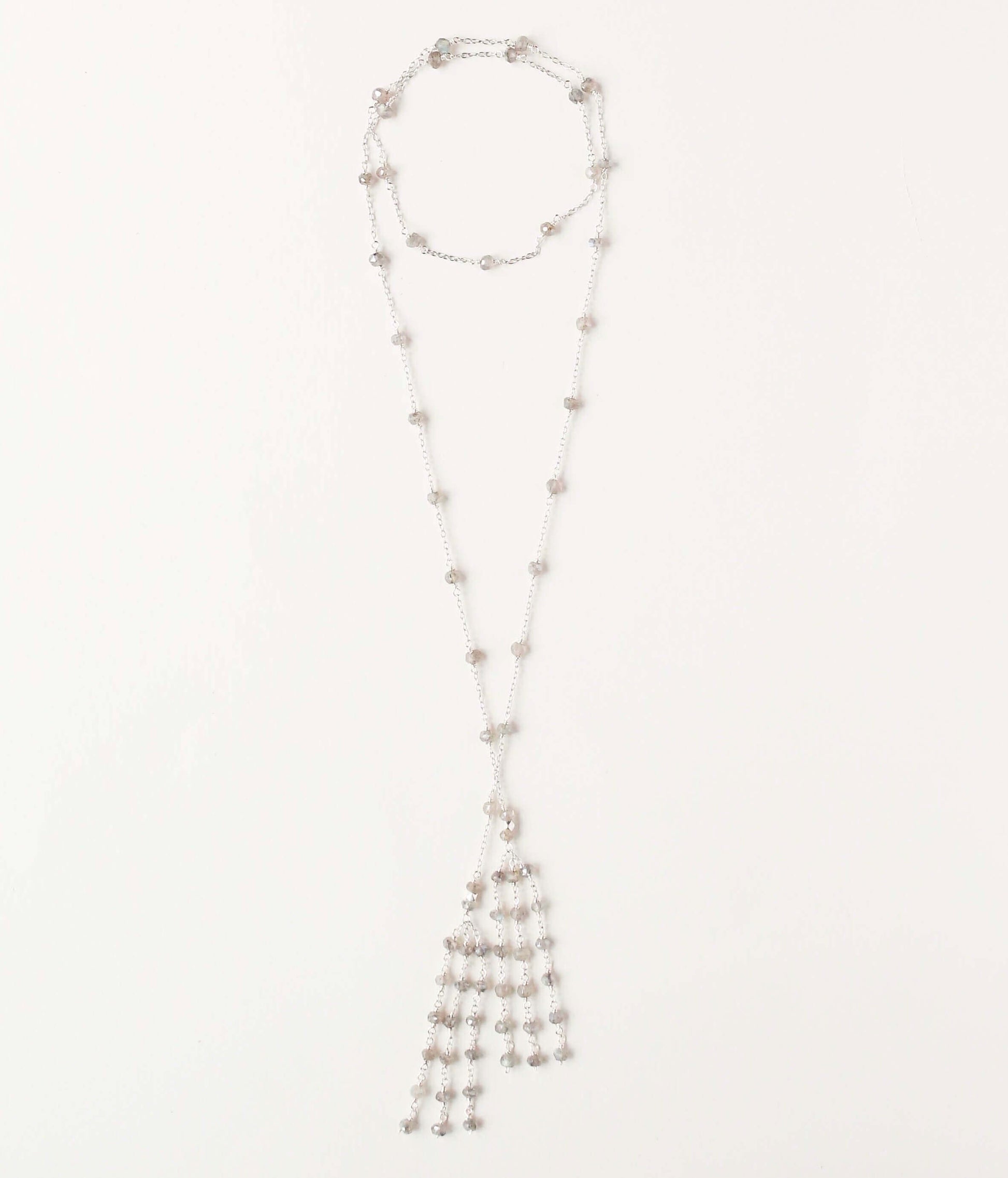 Delicate lariat necklace made with your choice of labradorite, pink tourmaline or london blue quartz gemstones and finished off with a beautiful tassel. Designed as a shorter lariat so it falls mid-chest.