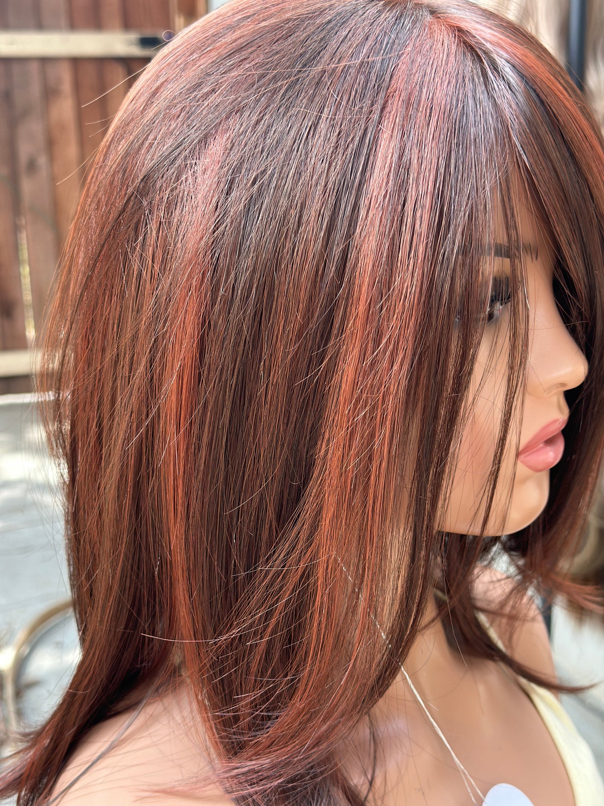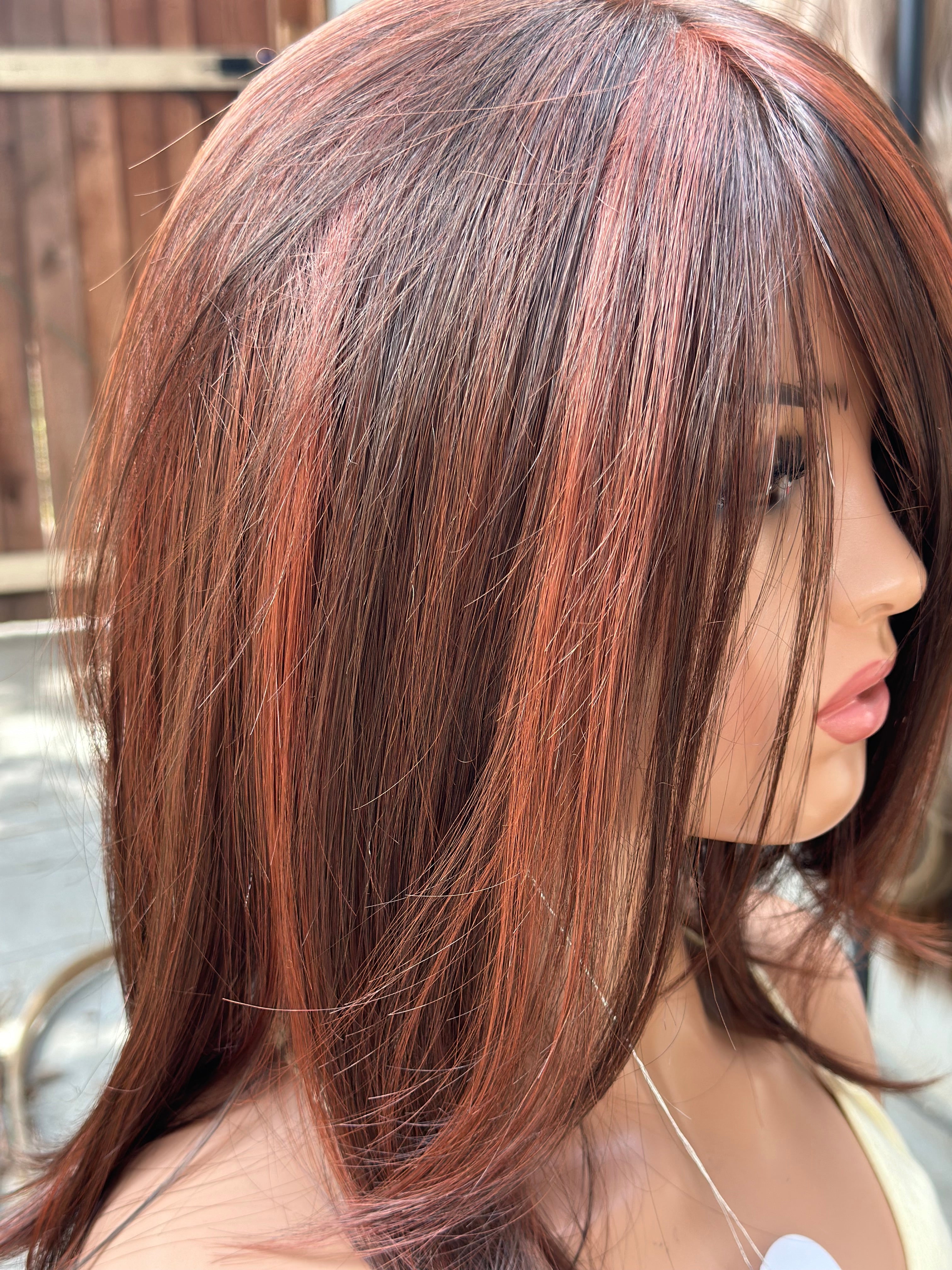 Introducing GIA Coppernette, the perfect blend of style and technology. This premium lace front wig features a full monofilament construction for a natural look, a free part for versatile styling, and a durable Futura synthetic fiber blend that resists heat and moisture. Designed with 16 inches of layering curtain bangs in a rich dark brown with copper highlights, and an adjustable cap size for the perfect fit. Upgrade your look with GIA Coppernette.